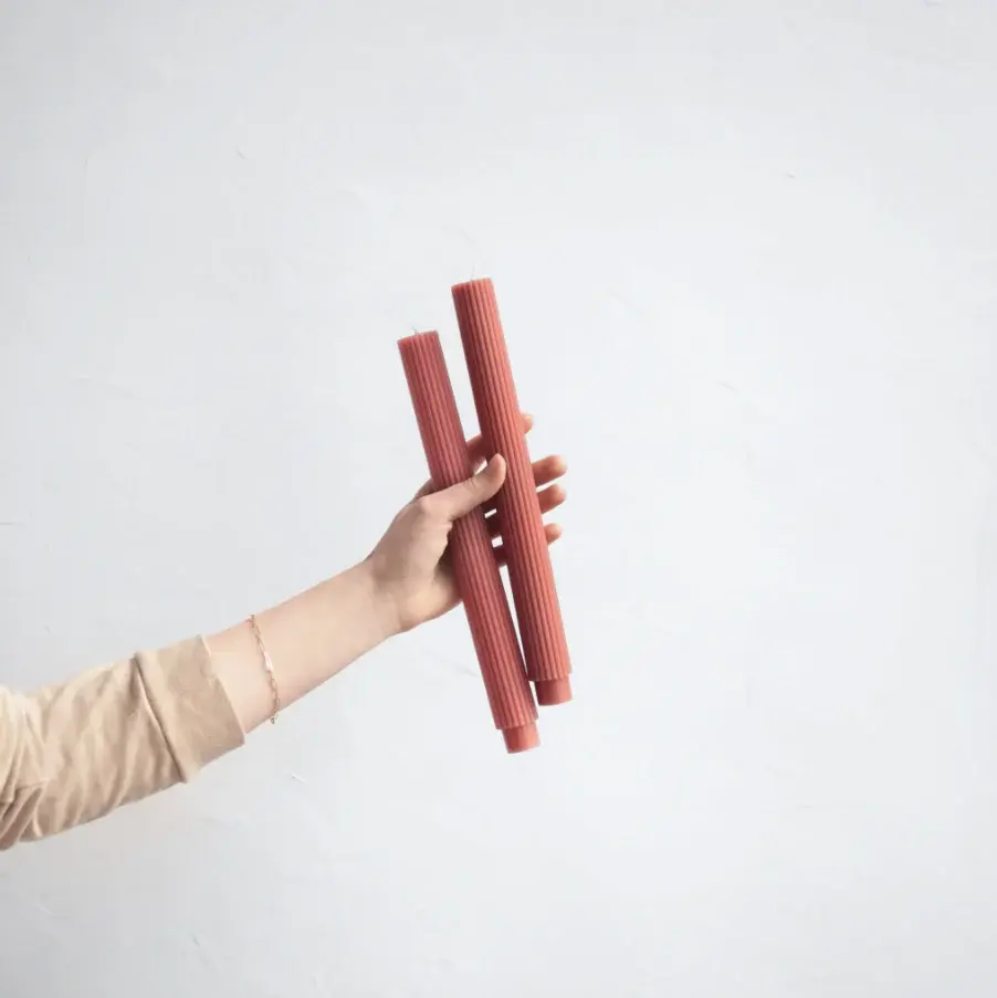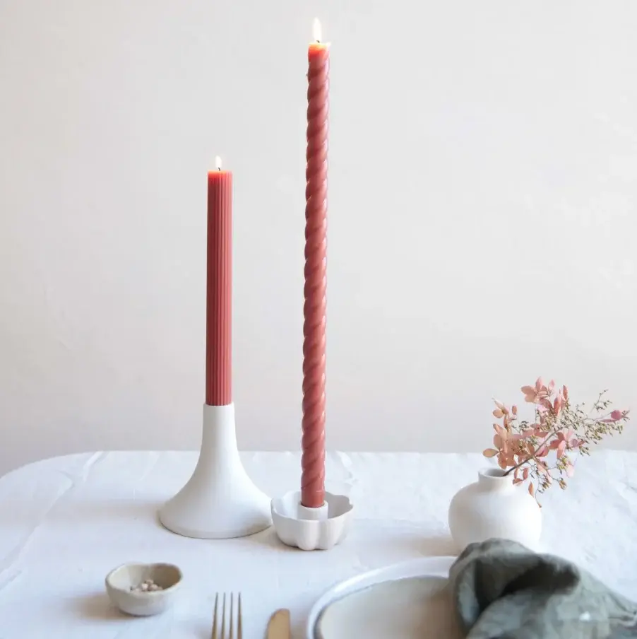 Our Fancy Taper Candles are hand-molded and embody a superior depth of color. A cotton wick is used for the cleanest burn, and the base is sized to fit a standard holder. Each 10” candle is fashioned to burn for ten hours. Subtle variations in wax depth and color opacity may occur.