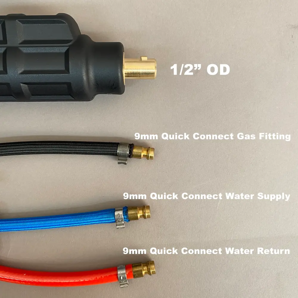 20 Series (250A) water-cooled TIG welding torch with a 35 Dinse (1/2″ OD) adapter for power/current supply, 9mm quick connect/disconnect water-in and water-out fittings, and a 9mm quick connect/disconnect gas fitting. Our water-cooled TIG welding torch also includes a zippered Nylon outer cable cover, a tool-less connection torch head, and super-flexible, color-coded cables. The torch features a rated duty-cycle of 100% at 250 amps.