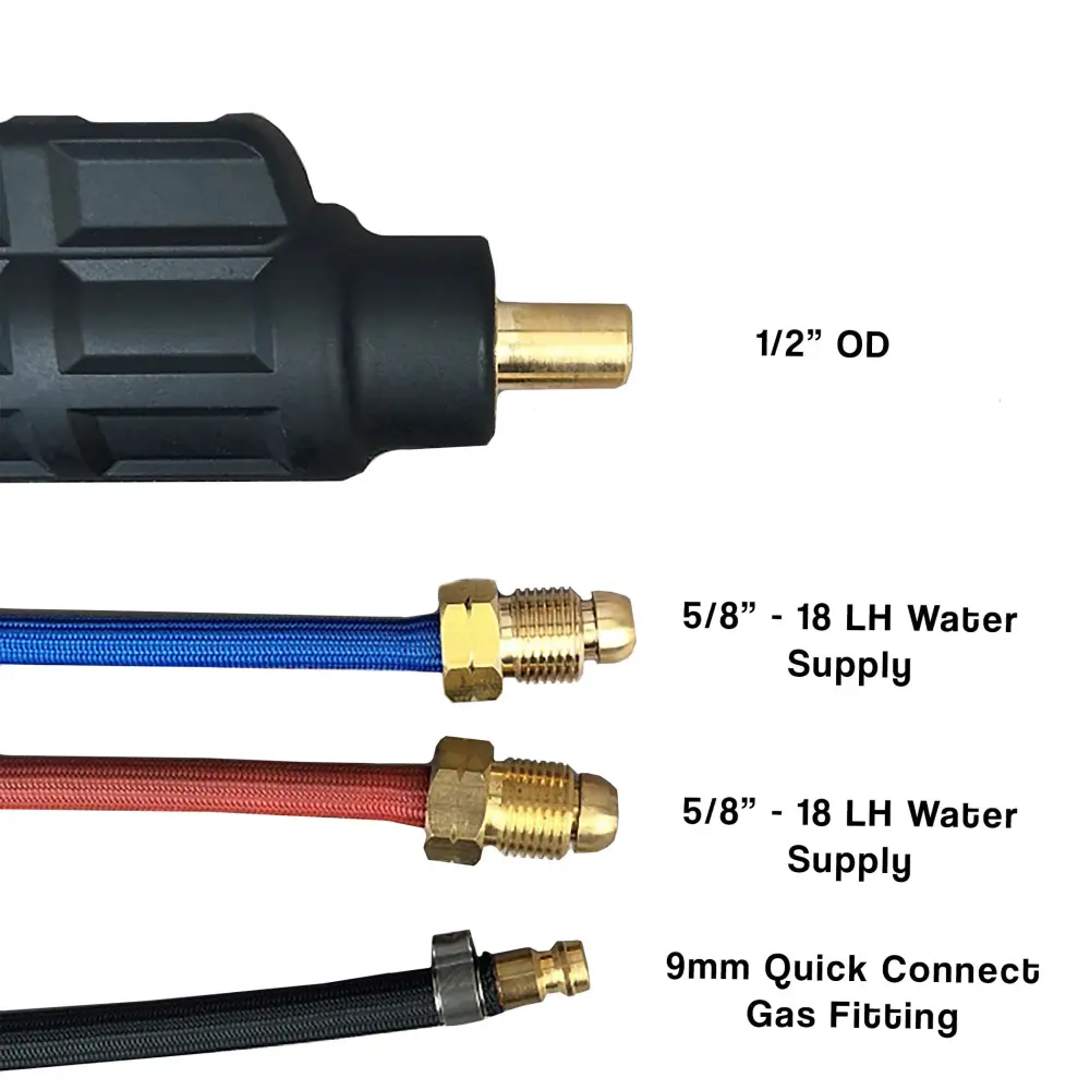 20 Series (250A) water-cooled TIG welding torch with a 35 Dinse (1/2″ OD) adapter for power/current supply, 5/8″-18 LH water-in and water-out fittings, and a 9mm efficient connect/disconnect gas fitting.(If your water cooler also has the 9mm quick connects please see part# 2012-35D-3QD) Our water-cooled TIG welding torch also incorporates a zippered Nylon outer cable cover, a tool-less connection torch head, and super-flexible, color-coded cables. The torch features a rated duty-cycle of 100% at 250 amps.