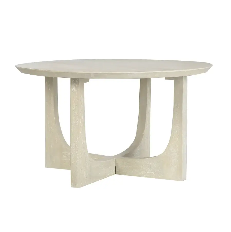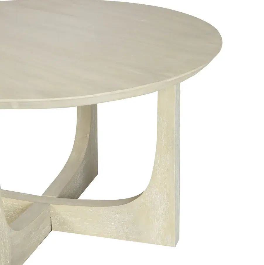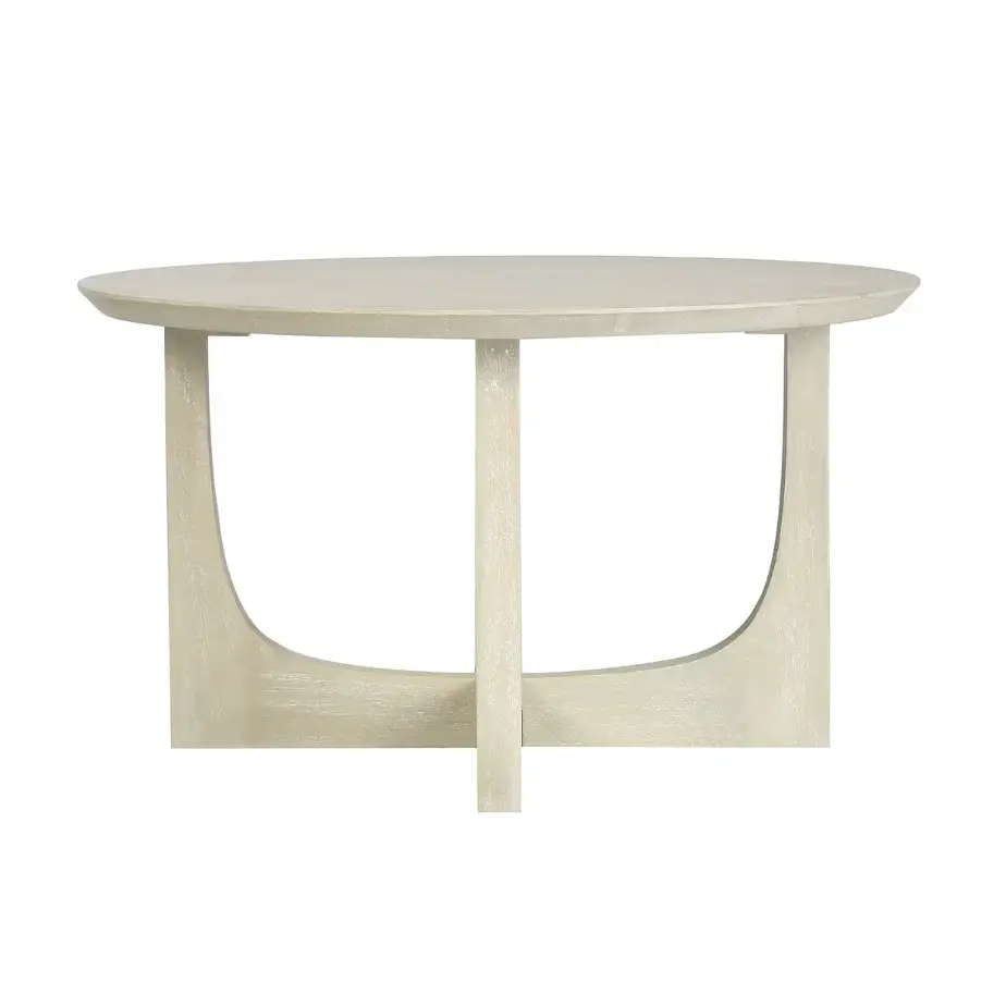 The modern, reverse arch leg design gives this round coffee table a striking architectural silhouette. Crafted from sustainable, solid mango wood and handfinished with a wire-brushed texture to create an sustainably-grown softness to contrast the minimal, clean lined shape. Available in two versatile colors: ivory or dull-finish black, this table is the perfect balance of simplicity and bold, contemporary design.