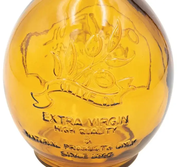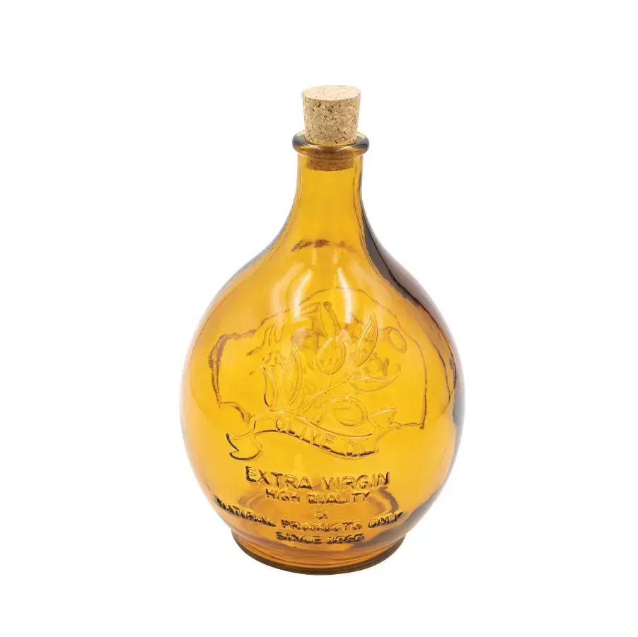 This amber embossed reclaimed glass bottle with cork stopper, “Olive Oil Extra Virgin,” is a lovely and practical way to store and display olive oil. The warm amber color of the glass complements any French country, farmhouse, old-school, or cottagecore kitchen decor. Whether used for cooking, dressing salads, or simply as a decorative accent, adding a rustic elegance to the home.