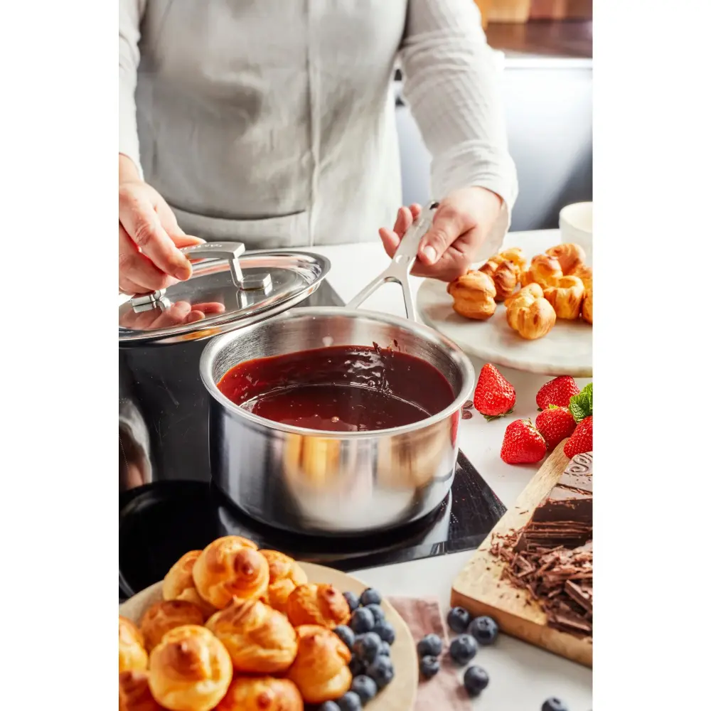 Discover the 5-Ply 4-qt Stainless Steel Saucepan by DEMEYERE. Developed in Belgium to meet the demands of busy restaurant kitchens, this stainless steel saucepan is an excellent choice for simmering sauces, steaming fluffy grains, and blanching tender veggies. Featuring a durable 5-ply construction and a thick aluminum core, DEMEYERE’s 5-Ply 4-qt Rust-proof Steel Saucepan offers superior heat retention and even heating. The brand’s signature flat base technology makes it fully induction compatible and hot-spot free, no matter what stovetop you cook on.