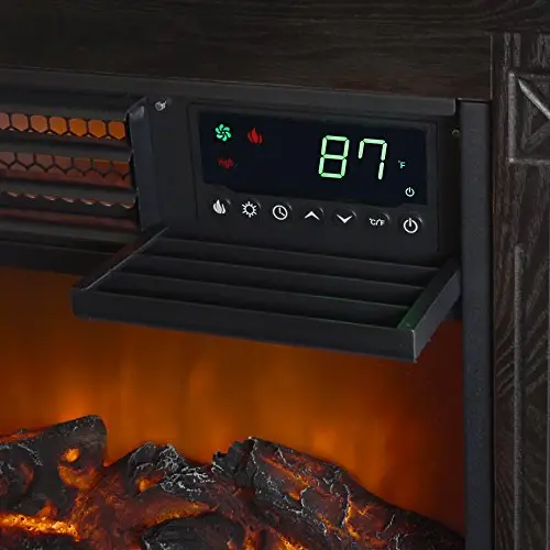 Maintain your perfect temperature with pinpoint precision with the fireplace’s builtin LCD control panel. The thermostat features preset low heat [1,000W], high heat [1,500W], and an eco energy saving mode [68°F]. Users can also adjust to their desired degree among other controls: