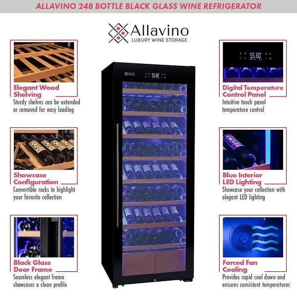 Allavino 248 Bottle Single Zone Freestanding Wine Refrigerator with Presentation Shelving and Black Glass Door – Right Hinge, KWR248S-1BGR, 810069434407