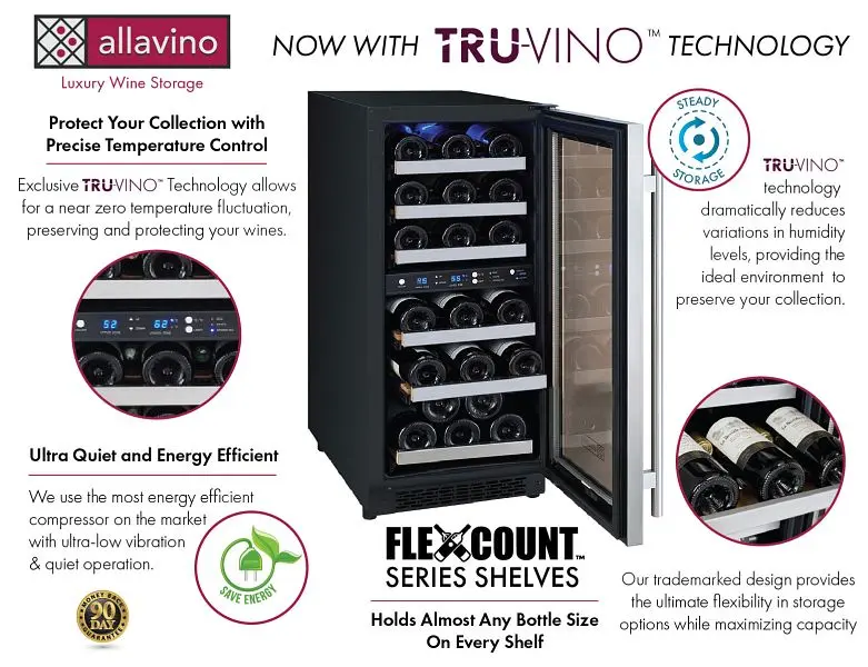 - Allavino’s FlexCount shelving design gives you flexible storage choices for up to 30 bottles of wine