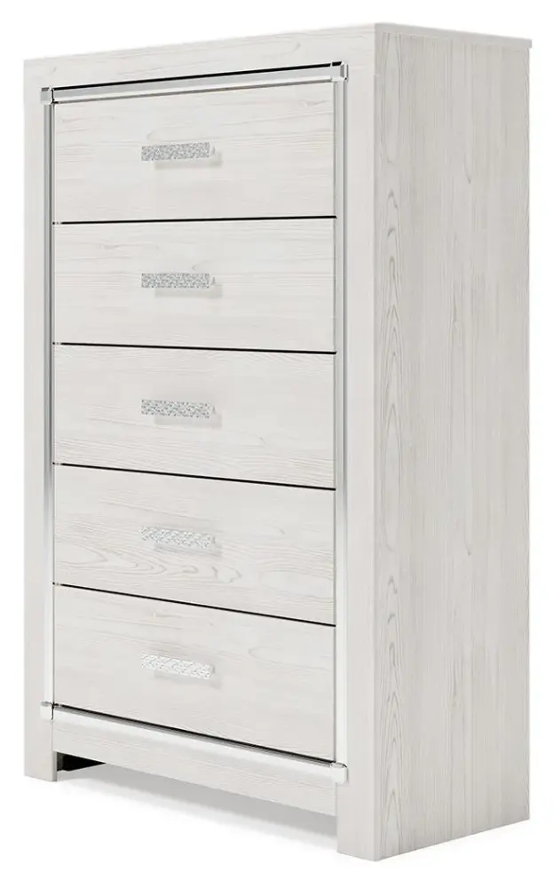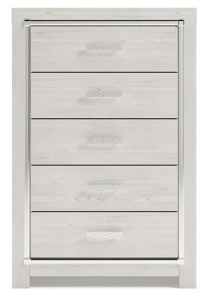 The epitome of fashion-forward design, this chest of drawers is a beautiful blend of style and luxury. Shiny chrome-tone accents, a pearlized finish and mosiac pulls bring a glam touch to the richly rustic appearance. Five smooth-gliding drawers provide plenty of storage space for your wardrobe needs.