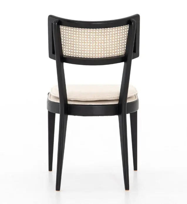 Mixed materials refresh retro dining style. Brushed ebony nettlewood frames a textural inlay of natural cane, for perfect contrast. Neutral premium-grade linen-blend seating for modern sensibility.