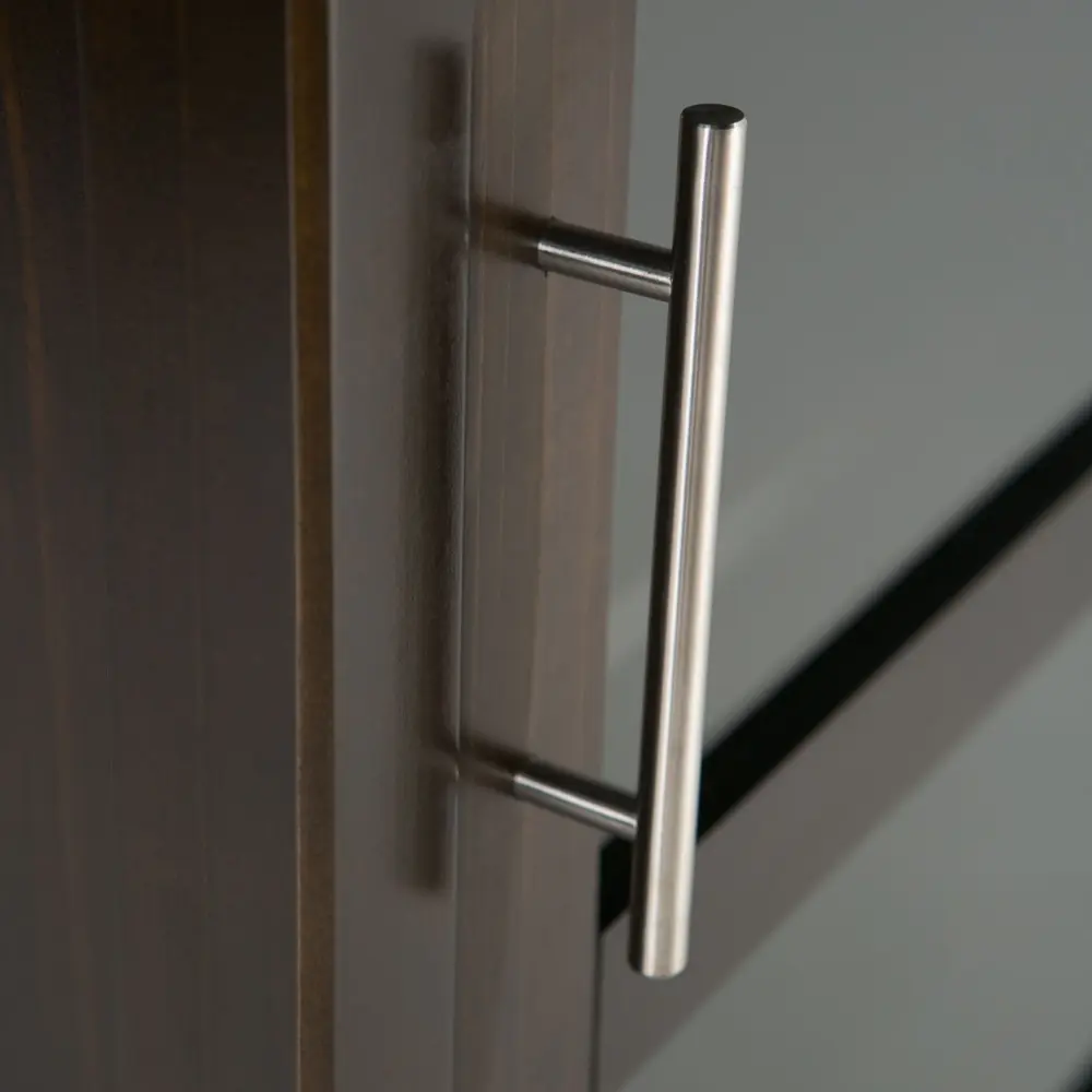 - Contemporary Style includes brushed Nickel long cabinet pull, sophisticated square legs and framed cabinet sides