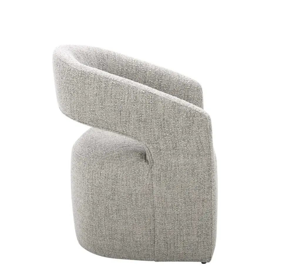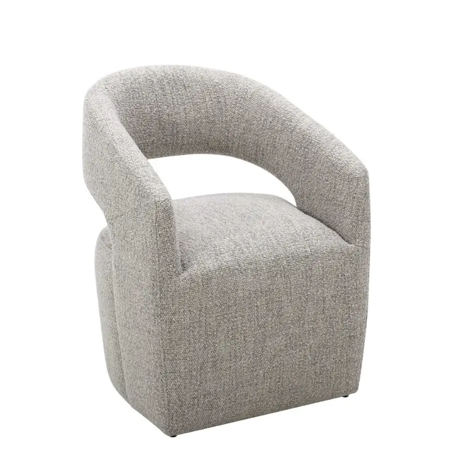 A contemporary dining chair upholstered with a NeverFear performance boucle, Barrow is easy to clean and easy on the eyes with a rolling base that lets you pass the peas and bounce from conversation to conversation. The curved back, along with the ultra-comfortable feather, high-density foam and poly-fill cushioned seat adds living room comfort to the dining experience.