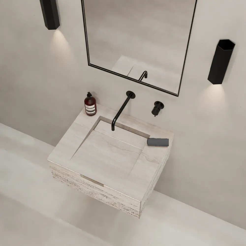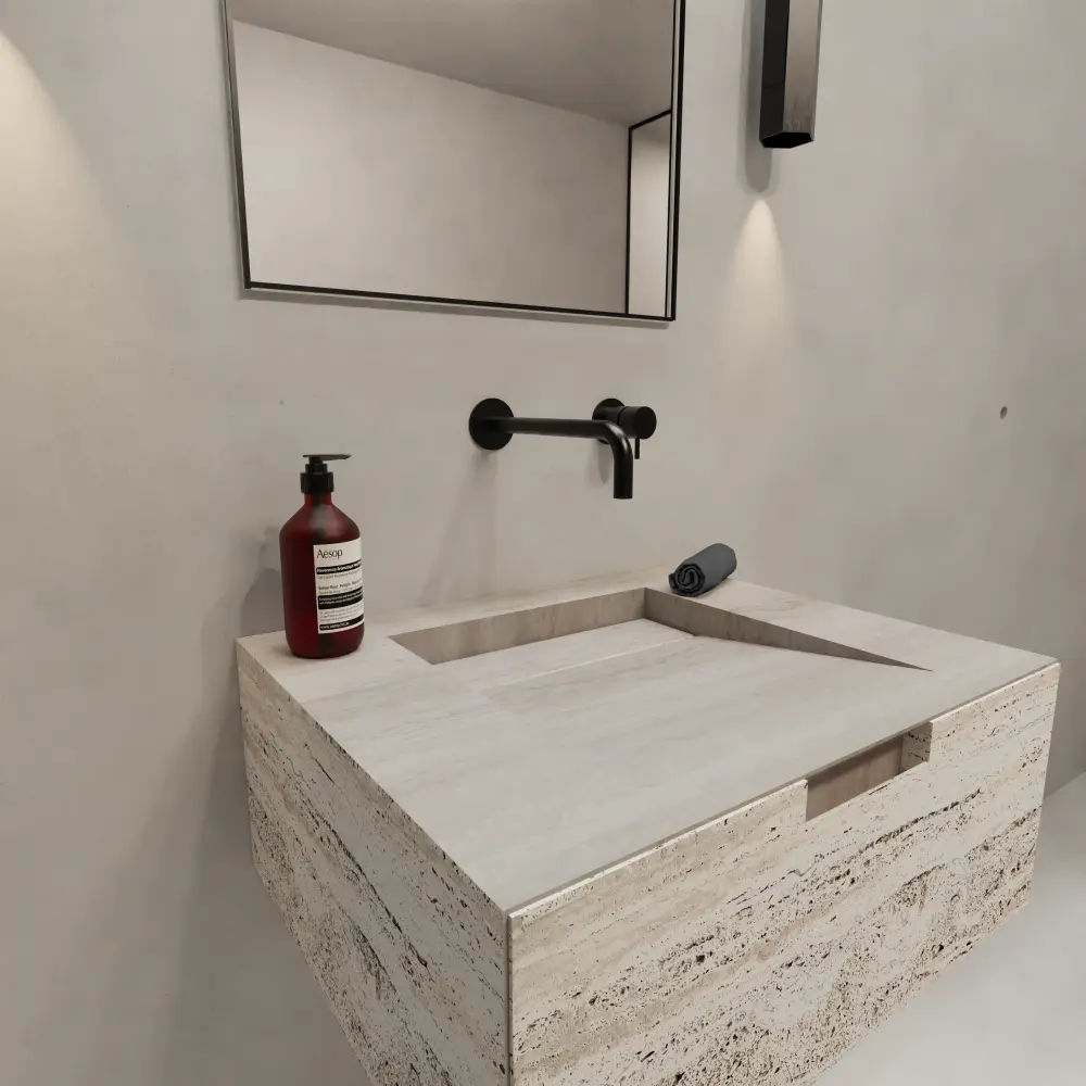 The travertine used in this hand basin is white travertine. This is a natural stone known for its striking textures and colors. Each hand basin is unparalleled, ensuring you always have a trendy and select item! Want to know more about this material? Read it on our blog.