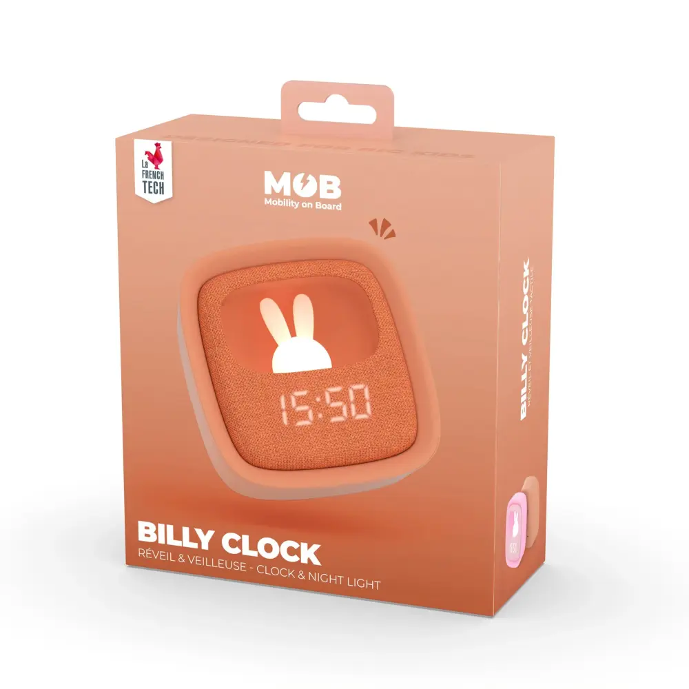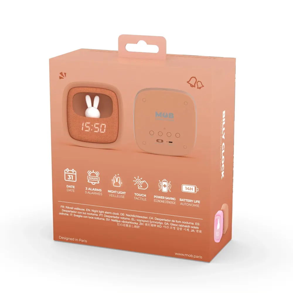 You can program the time, date and two alarms. The Billy alarm clock will watch over your treasures thanks to its night light integrated into the little soft silicone rabbit. The brightness is customizable via a touch button on the alarm clock, very easy to operate.