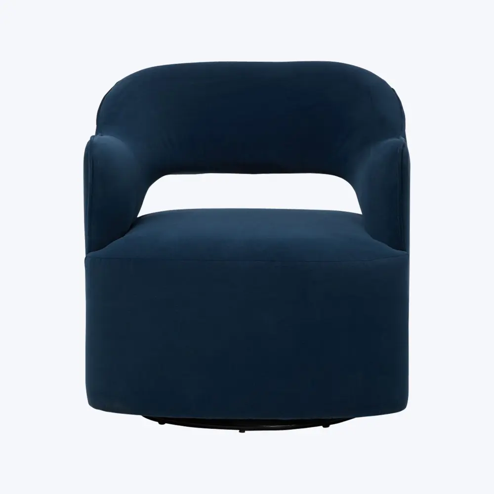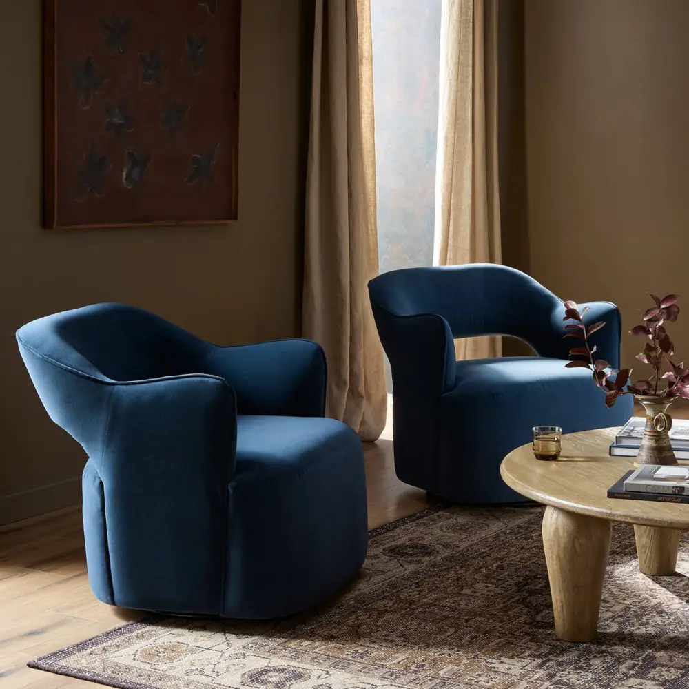 Discover the Blythe Swivel Chair by Four Hands. Featuring flared arms and a cutout back, this 360-swivel chair combines comfort with contemporary playfulness. Handmade with foam cushioning and S-spring suspension for a supportive sit. The Blythe is upholstered in high-quality performance fabric designed to withstand spills, stains, and everyday wear. Available in Crypton Henry Navy and Crypton Wayfarer Snow.