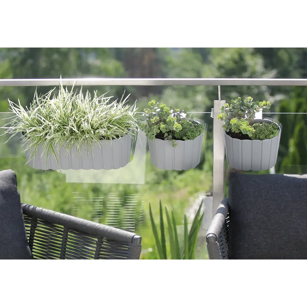 Oval balcony boxes to hang on rails. A simple form resembling dishes assembled of small boards, will give the space a unique expression.