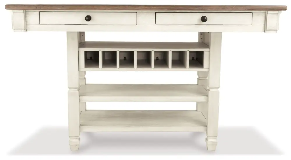 The beauty and practicality of this dining room counter height table are something to savor. A contrast trim textural finish provides a double helping of charm. Four smooth-gliding drawers allow you to keep placemats, napkins and utensils right on hand. And if you love to entertain, youβre sure to toast this tableβs built-in wine bottle rack.