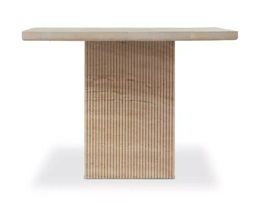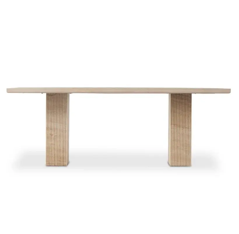 Solid marble and white oak fuse for a monochromatic look inspired by 1970s architecture. Linear rib detailing bring texture to a user-friendly pedestal base. Seats eight comfortably.