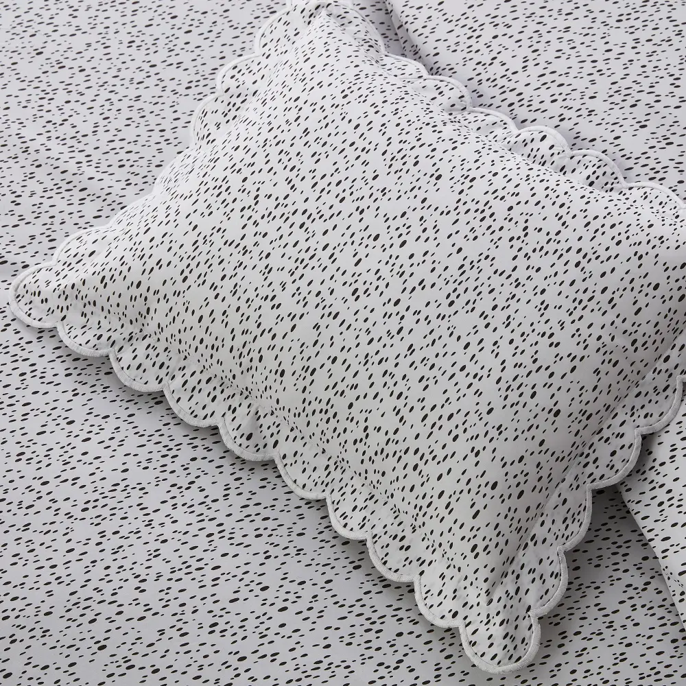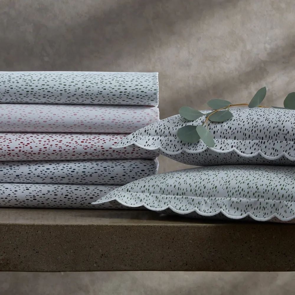 Chic and charming Celine features the painterly dots of Schumacher’s classic “Duma”, reimagined for the bed in five graphic colors that stand out against the chalk background of our 500 thread count Luca Egyptian cotton percale. Finished with a perfect scalloped edge, Celine is a go-to match for both vibrant prints and rich solid scalloped edge, Celine is a go-to match for both vibrant prints and rich solids.