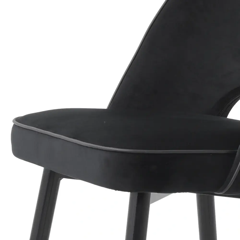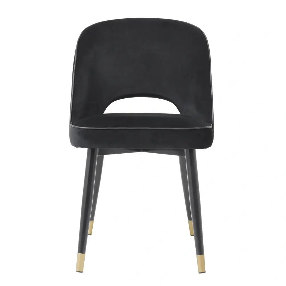 Create a wow-worthy dining room with the Cliff Dining Chair in Roche black velvet. Featuring black tapered legs with gold caps, the solid frame holds an armless back that is open at the bottom before the seat. Its stylish silhouette is accentuated with black faux leather piping.