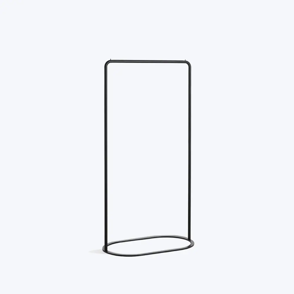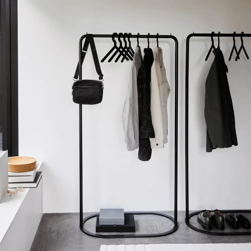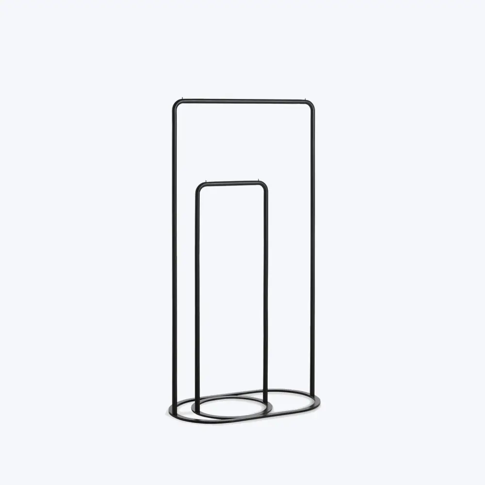 The O&O Clothes Rack, designed by Christine Rathmann, is inspired by two different shaped O-rings that belong together and can be arranged as desired in a variety of positions. The two separate elements, in different heights and widths, rise from the ground as a sleek but sturdy construction. Beautiful on their own or as a merged unit, place this clothing unit in the hallway, walk-in closet, or bedroom.