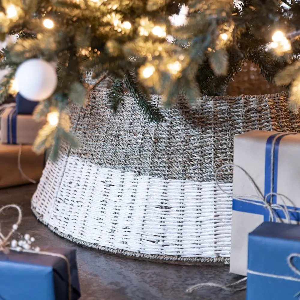 Elevate your holiday decor with this round foldable wicker tree skirt, featuring a stylish dipped white design. Crafted to conceal unsightly tree stands and wires, it secures easily with hook and eyelet fastenings. Portable for compact storage, this polished accessory adds charm and practicality to your festive setup.