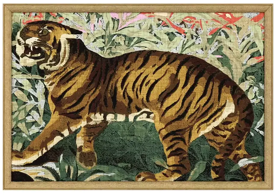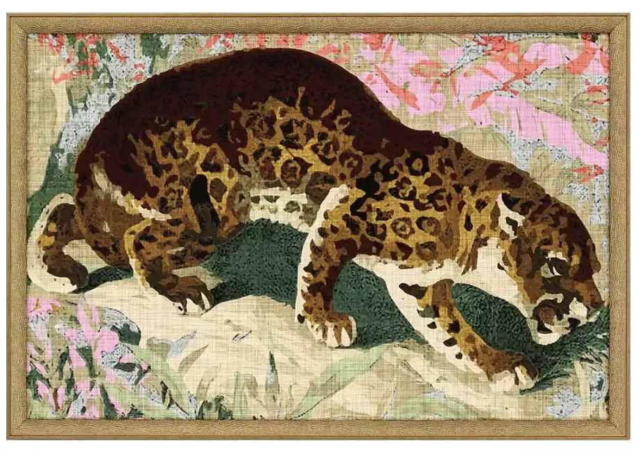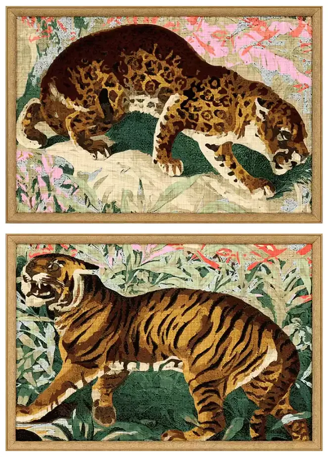 Fierce predators leap from a back drop of colorful foliage. Framed in an antique gilded wood with embossed weave pattern.