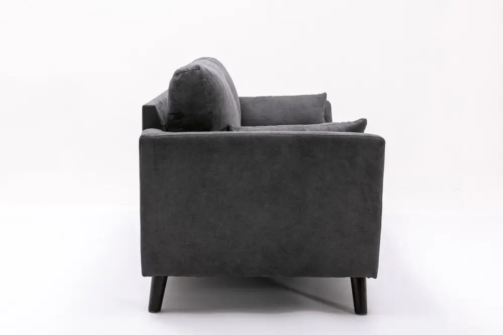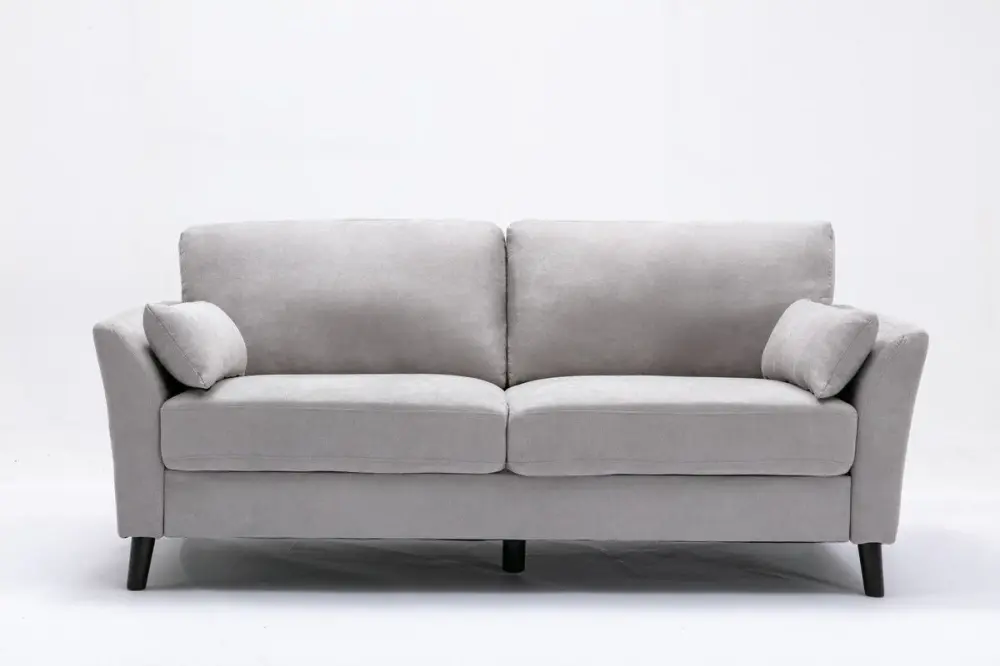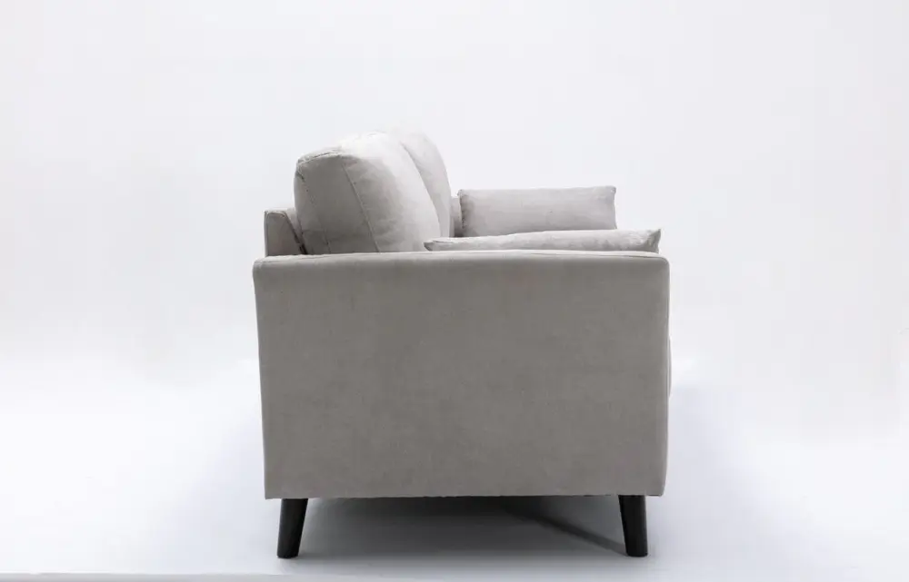 - The Damian sofa is a classic. It’s simple design is guaranteed to stand the test of time. The even surface of the cushions amplify the sense of order and cleanliness of any room. The 2 accent pillows included are constructed to keep guests comfortable according to their own needs. With solid wood legs as support, the Damian Collection is sure to fit the color palette of most rooms. Relaxing on comforting fabric has never been so easy.