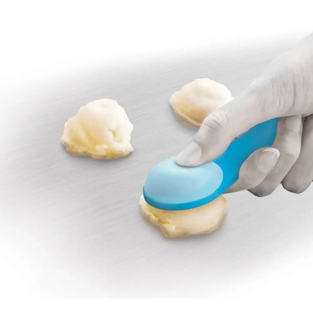 Non-stick silicone pops out 1 tbs dough for consistently sized cookies.