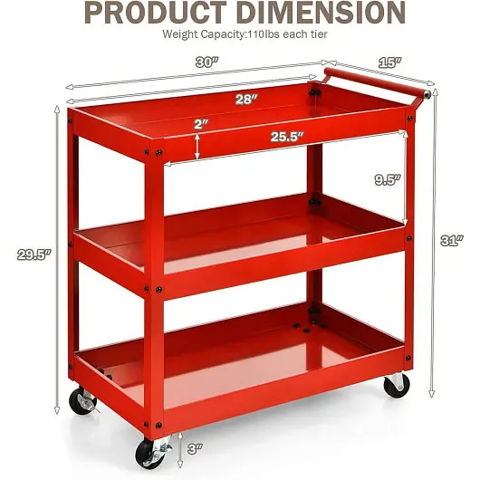 Large Storage Capacity: This 3-tier utility cart features spacious storage space, which can hold all kinds of items at one time and sort them neatly. The upper layer can place some commonly utilized items for simple access, while the lower layers can hold different tools to improve work efficiency.