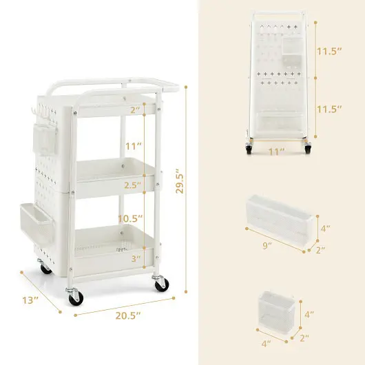 - Package includes: 1 x 3-tier utility cart, 2 x Pegboard, 2 x Storage bin, 4 x Hook, 1 x Instruction
