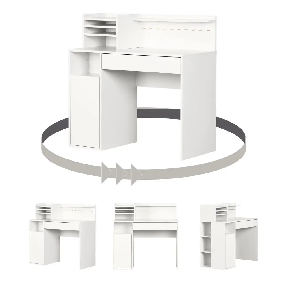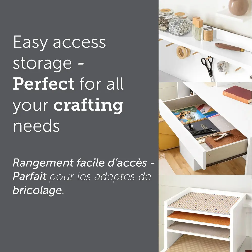Made for DIY fans Do you enjoy DIY? Then this table is made for you! It has 10 wooden rods that you can use to hang all your essentials: ribbons, scissors, thread, bobbins, etc. The upper shelf of the table is first-rate for organizing your tools and accessories. And here’s a tip: Place them in slim glass jars for a little vintage touch! Shelves for scrapbooking fans Binder-style shelves on the left-hand side were especially designed to contain square scrapbooking papers. Your sheets will be perfectly organized, without poking out. This piece of furniture will put you in the big leagues! A well thought out piece We crafted this table to be as functional as possible. The large drawer can hold items you want to keep out of sight, while the cabinet with adjustable shelves lets you organize your space according to your needs. You also have an open space for making certain materials more accessible. Finally, we also added a lateral open space to the side of the table. Although its dimension