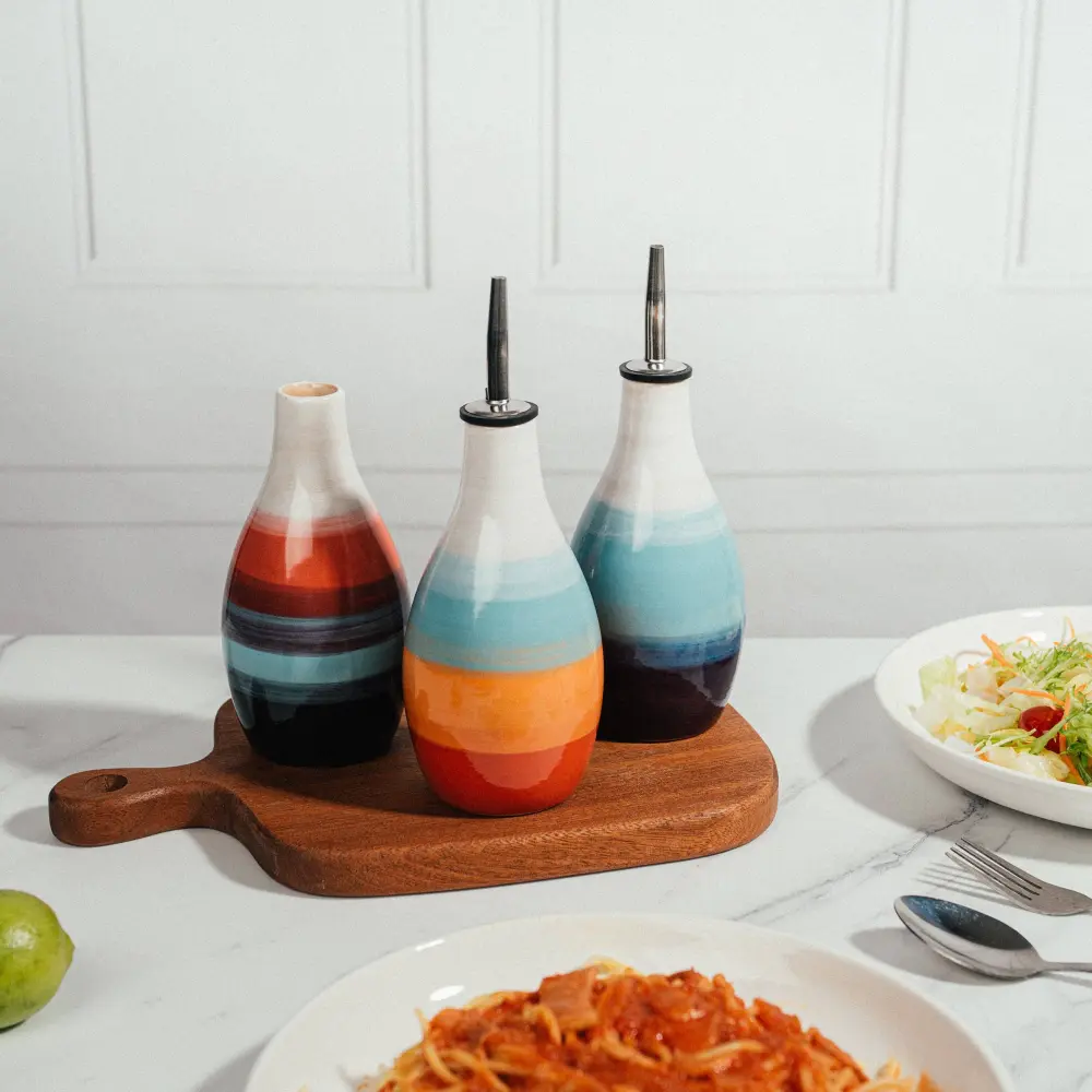 This handmade ceramic olive oil and balsamic vinegar pot is both practical and attractive. The drip-free spout ensures a generous flow of your favorite dressing without overpouring. At the same time, the deep reservoir holds enough to last you a considerable time between refills—a staple kitchenware item. The Gute table oil and vinegar cruet is a fun, functional, and original object that makes culinary preparation fun and easy. The earthenware cruet by Gute features a unique, drip-free spout that allows the excellent combination of oil, vinegar, and food to be poured directly into the bowl with a uncomplicated push.
