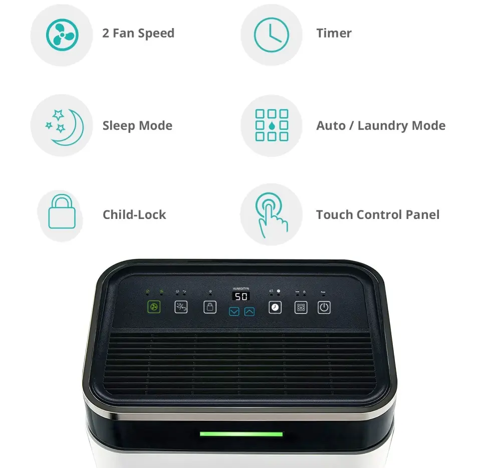 The ambient humidity indicator enables easy monitoring of conditions, while two fan speeds optimise energy efficiency. Premium for any space, it effectively combats dampness and enhances indoor air quality, backed by a 2-year warranty.