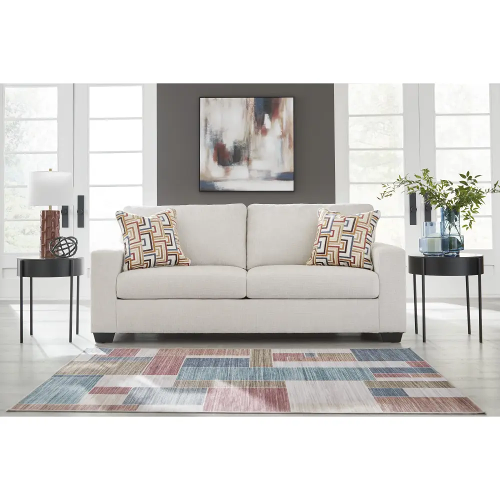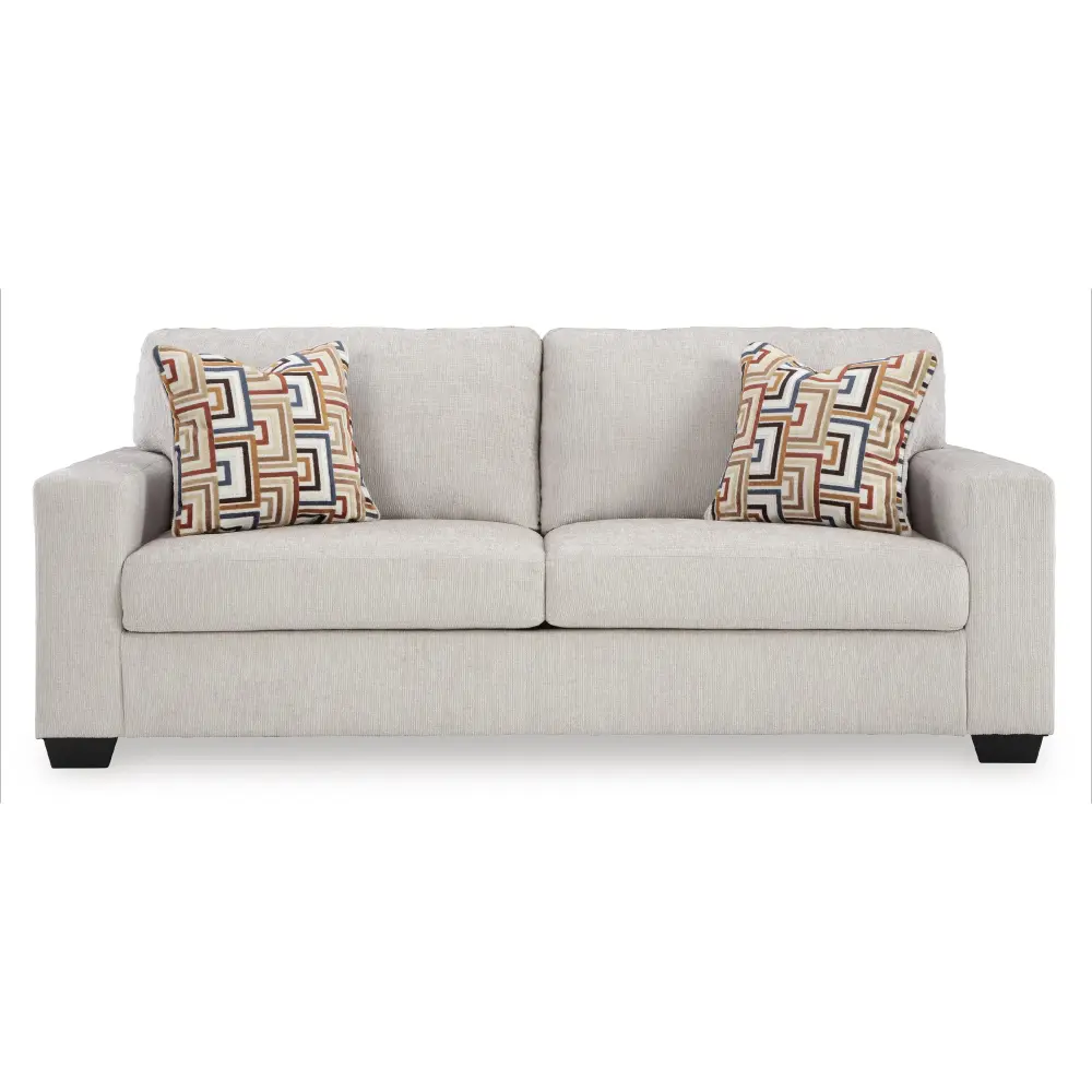 Looking to make a simply chic statement with color? Liven up your living room with this queen sofa sleeper. Its trend-right airy neutral upholstery is a perfect blank canvas for adding pops of color. Bold and eclectic accent pillows complete the look. And the pull-out queen mattress in quality memory foam comfortably accommodates overnight guests. Pairing posh style with everyday comfort, this piece is a welcome addition to contemporary spaces.
