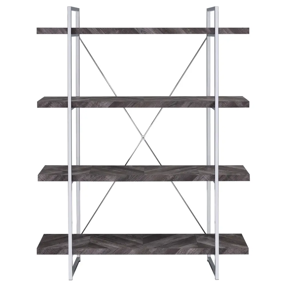 Perfect for storage or display, this wooden bookcase exudes understated glamour. Its frame is comprised of crisp, clean all-metal lines with an eye-catching, X-shaped design on the back. Its shelves are crafted with grade-a wood for added sturdiness and durability. A rustic grey herringbone finish blends beautifully with the high-shine chrome finish of its frame. With its simple yet stately design, this contemporary bookcase is a stunning addition to any modern home.