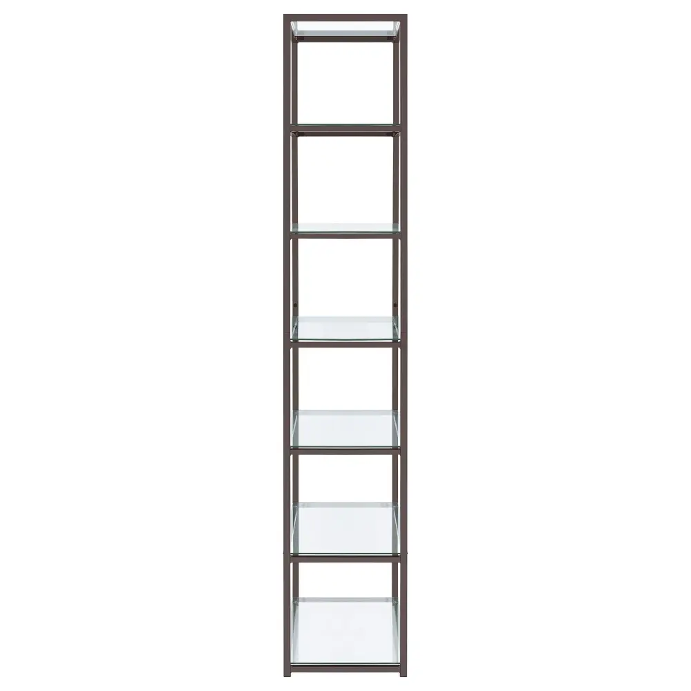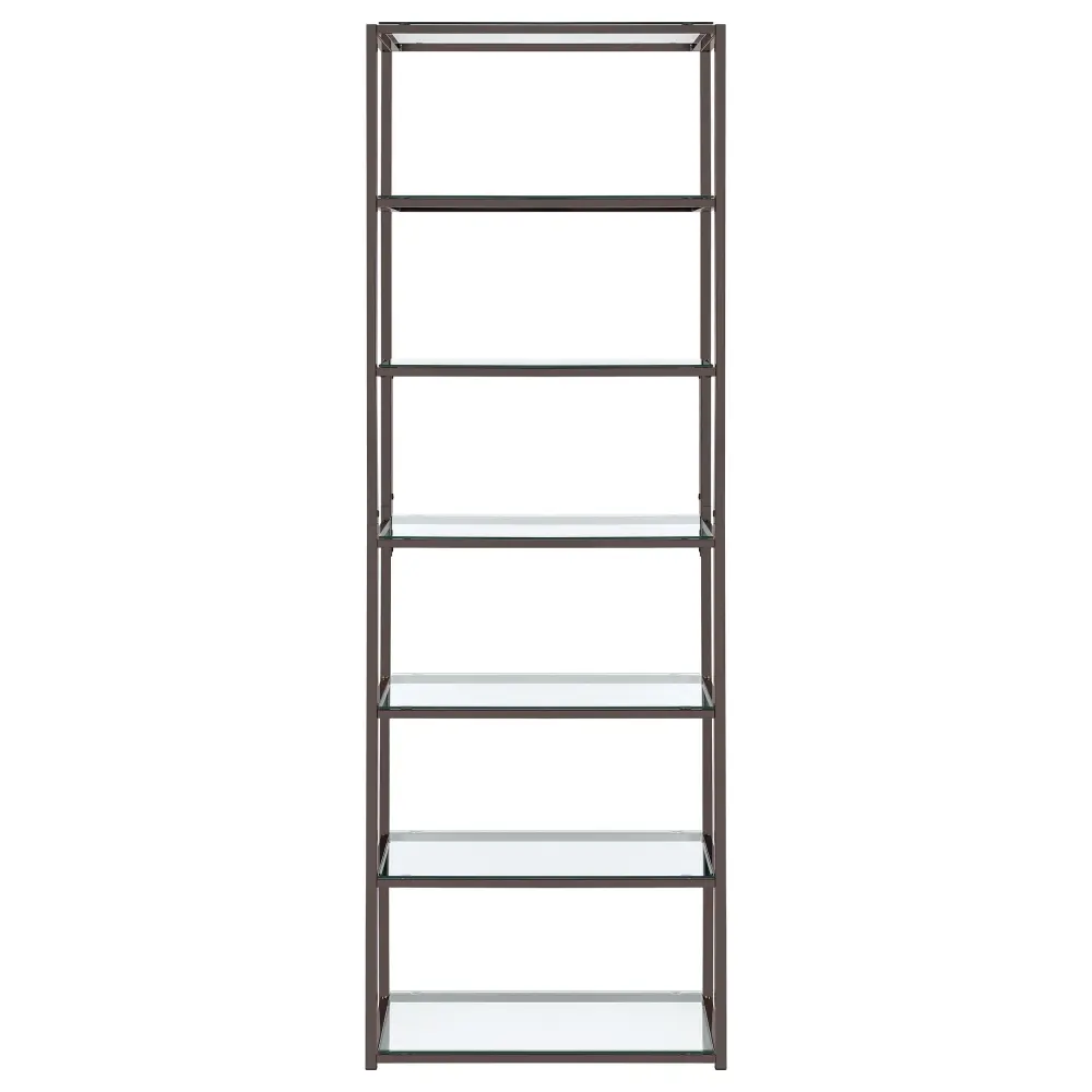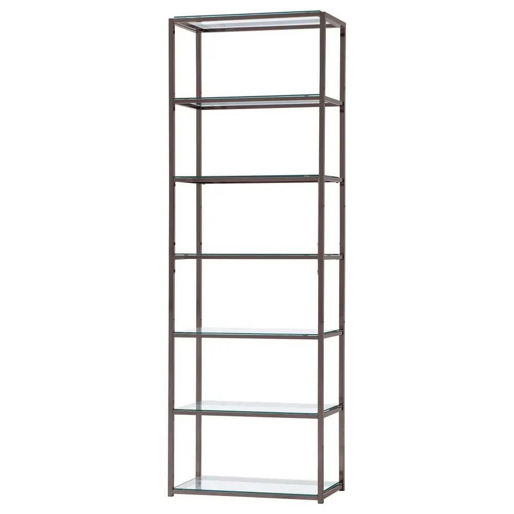 Sleek, graceful, and stylish. This bookcase brings a tasteful look to a contemporary living room or family space. Assembled from steel with a black nickel finish, its frame is delightfully neutral, yet beautiful. Clear tempered glass shelving offers a gorgeous coordinating look. Display decor, books, and miscellaneous on six tiers of shelving.