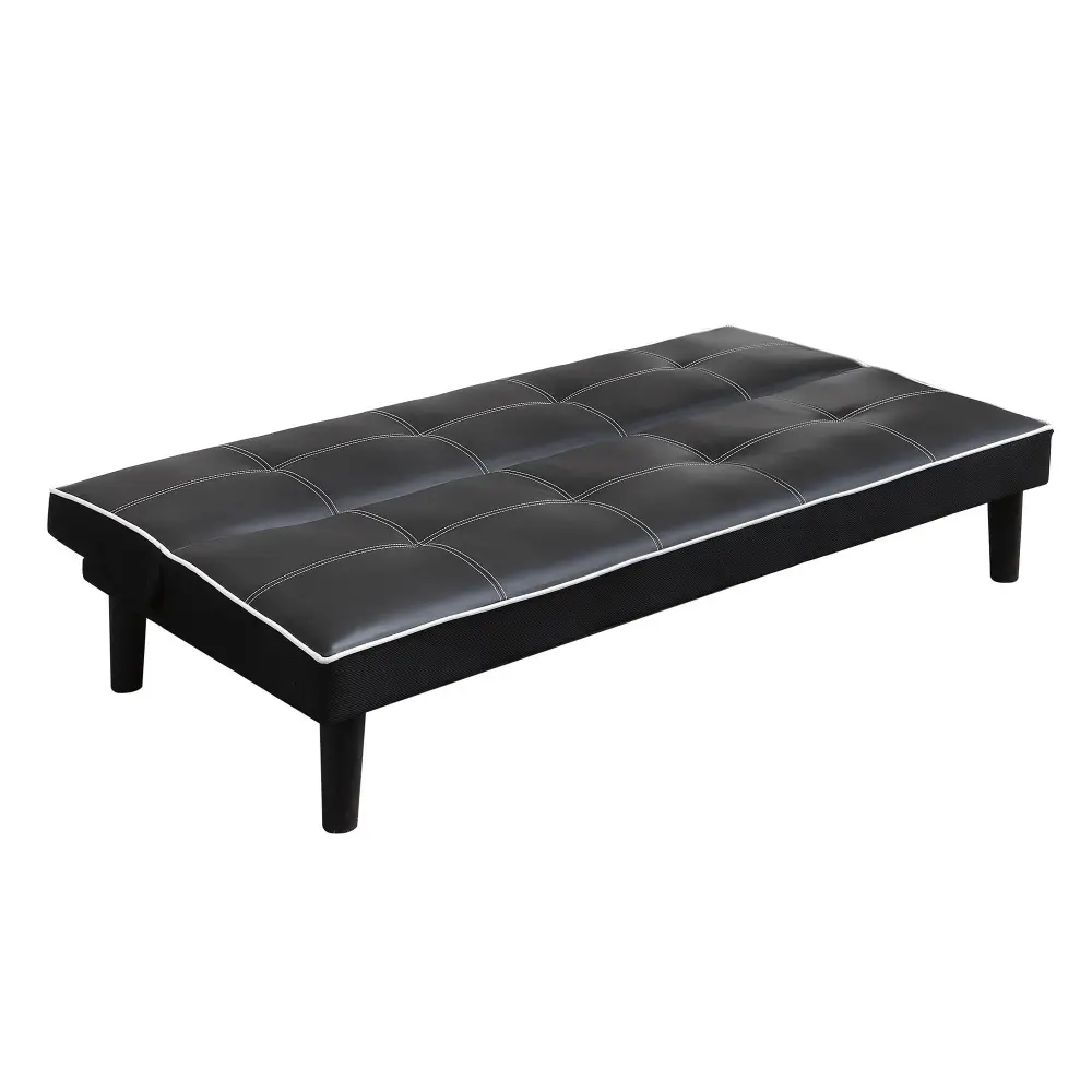 Put sleek and versatile structure to any living room with this black sofa bed. Featuring a modern silhouette, the cushions rest on top of a durable kiln dried hardwood frame. The dark leatherette upholstery is given contrast with a lightly hued piping and square-shaped tufting. Designed for comfort, this sofa bed is total with sinuous spring decking and high-density foam. This sophisticated piece is also available in grey with black piping and brown with tan piping.