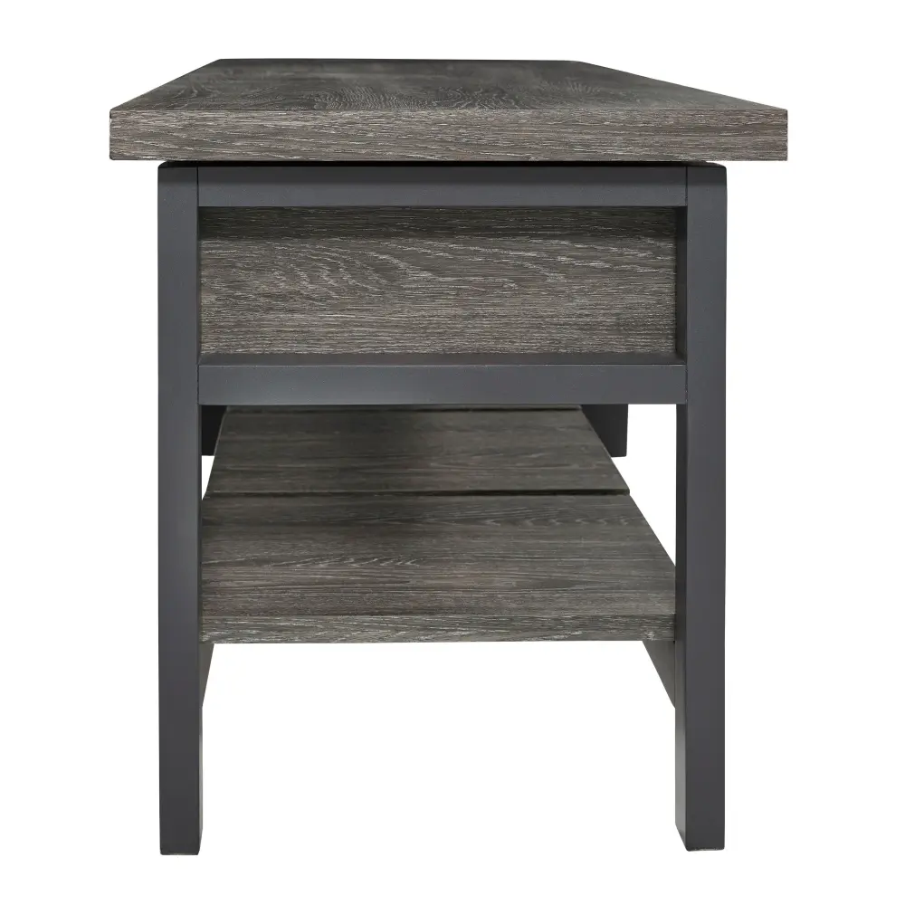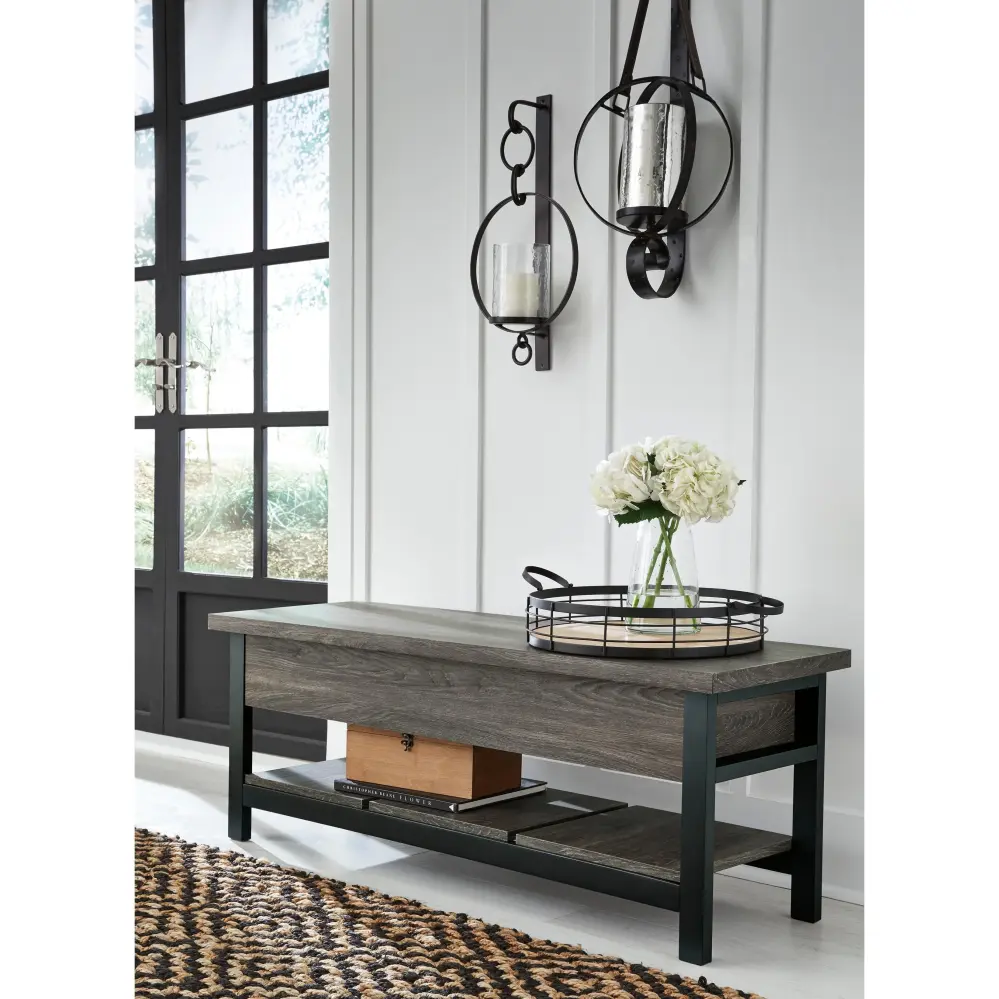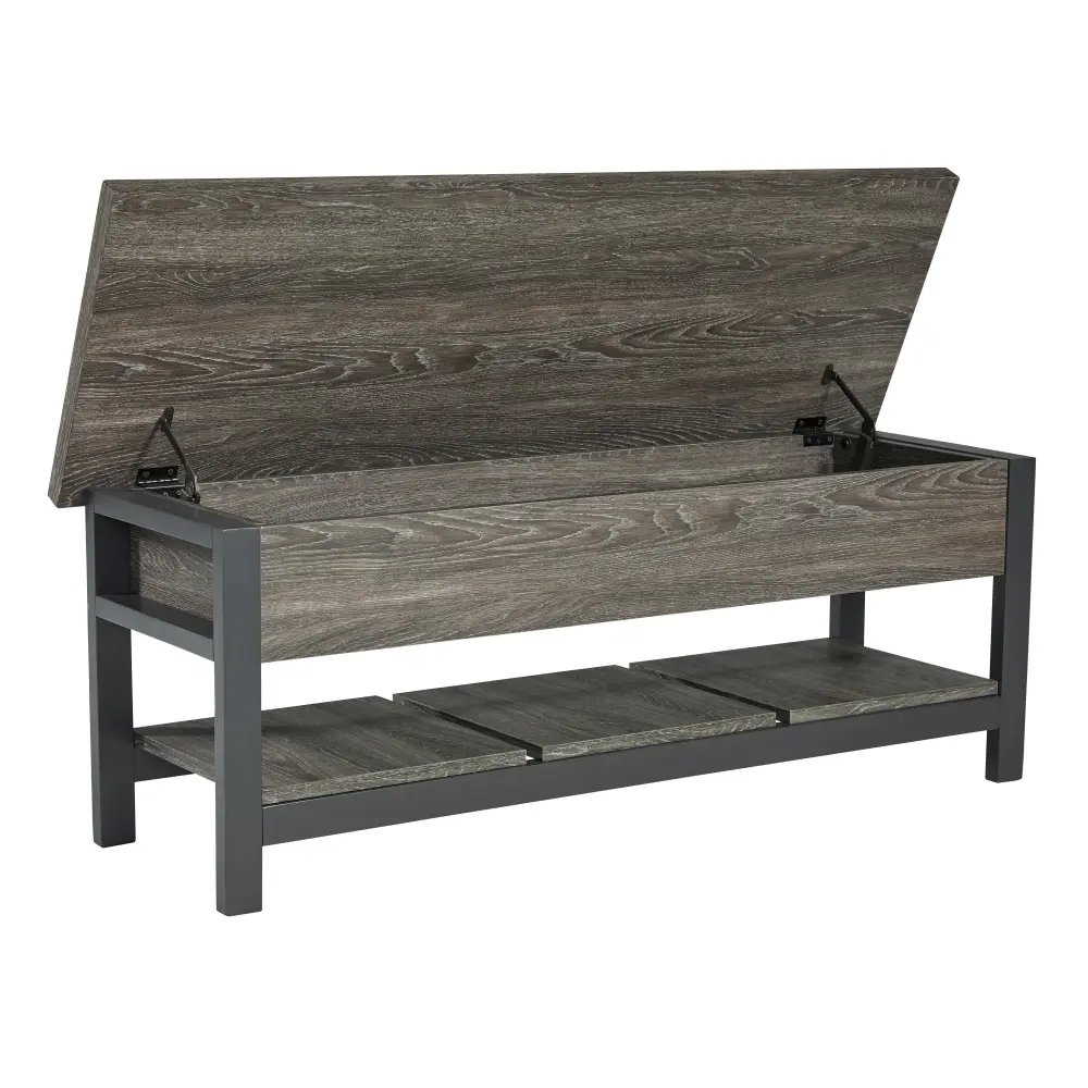Seating with style and storage—what more could you need? This storage bench has a hinged seat and plank shelf, making it the perfect multi-use piece. The gray and espresso wood grain effect lends a casual touch.