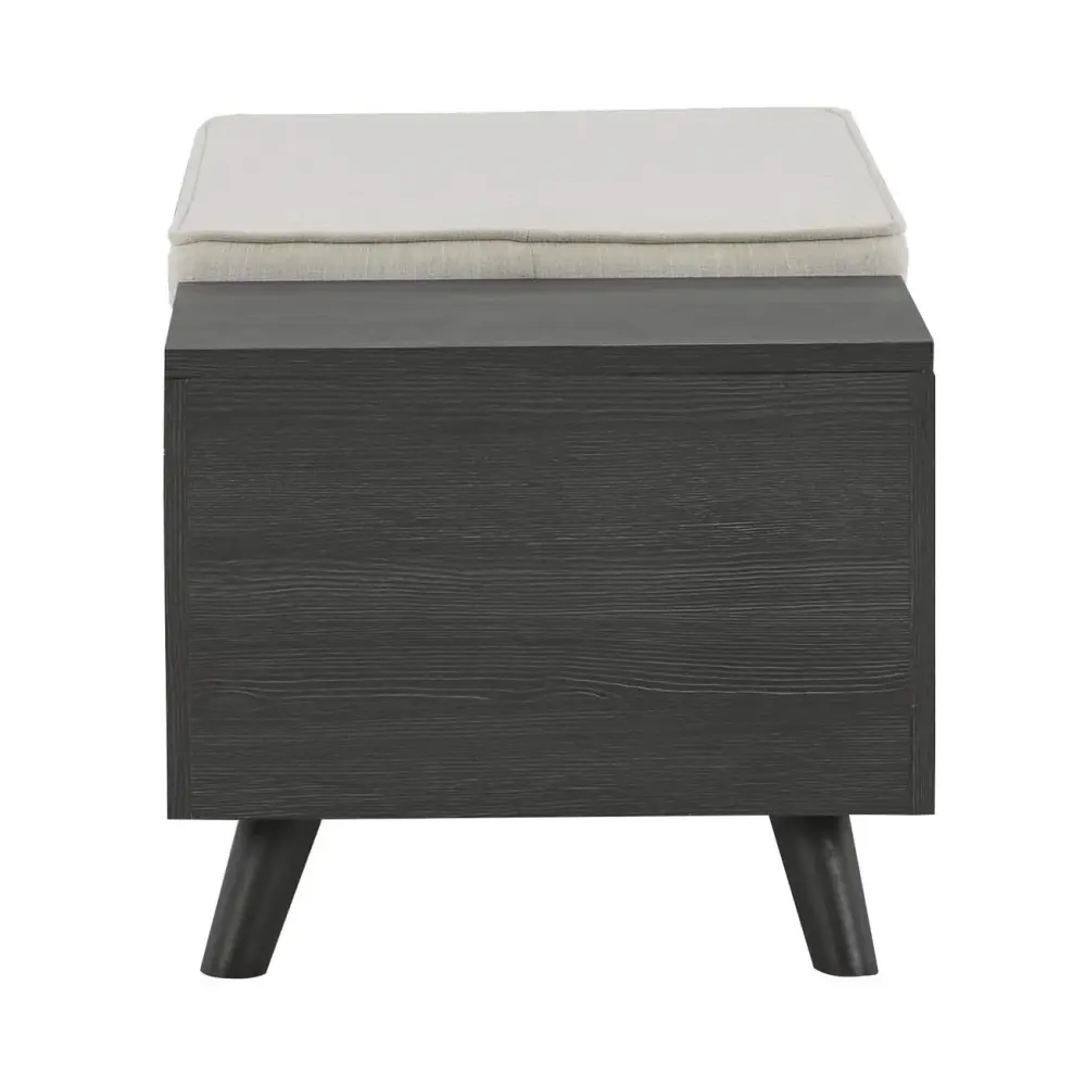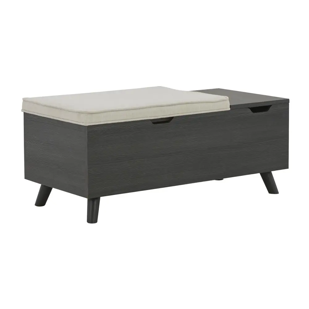 The clean profile of this small storage bench makes an entrance anywhere and everywhere you place it. Replicated blackened wood finish with a grayed textural grain and tapered wood legs lend a fresh flair. Adding form and function, both tops are detachable to expose hidden storage underneath. A must-have piece for small spaces.