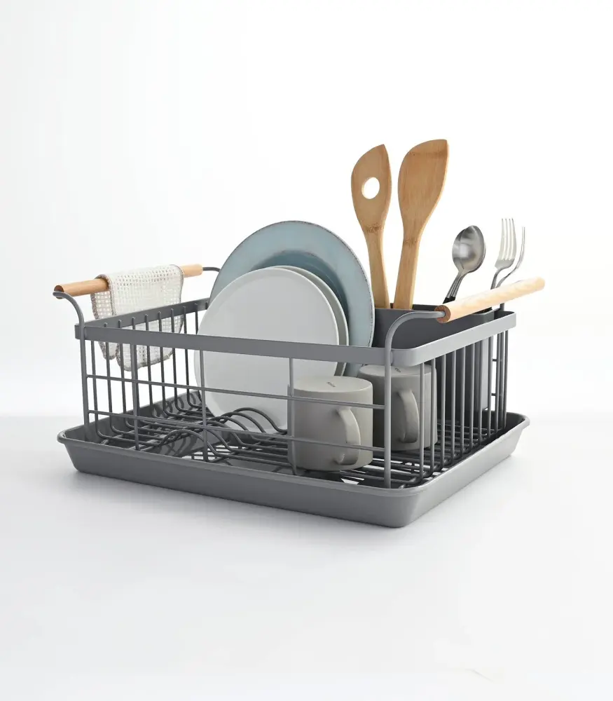 - Dish rack’s frame is made from coated-steel. Wood handles are made from ash.