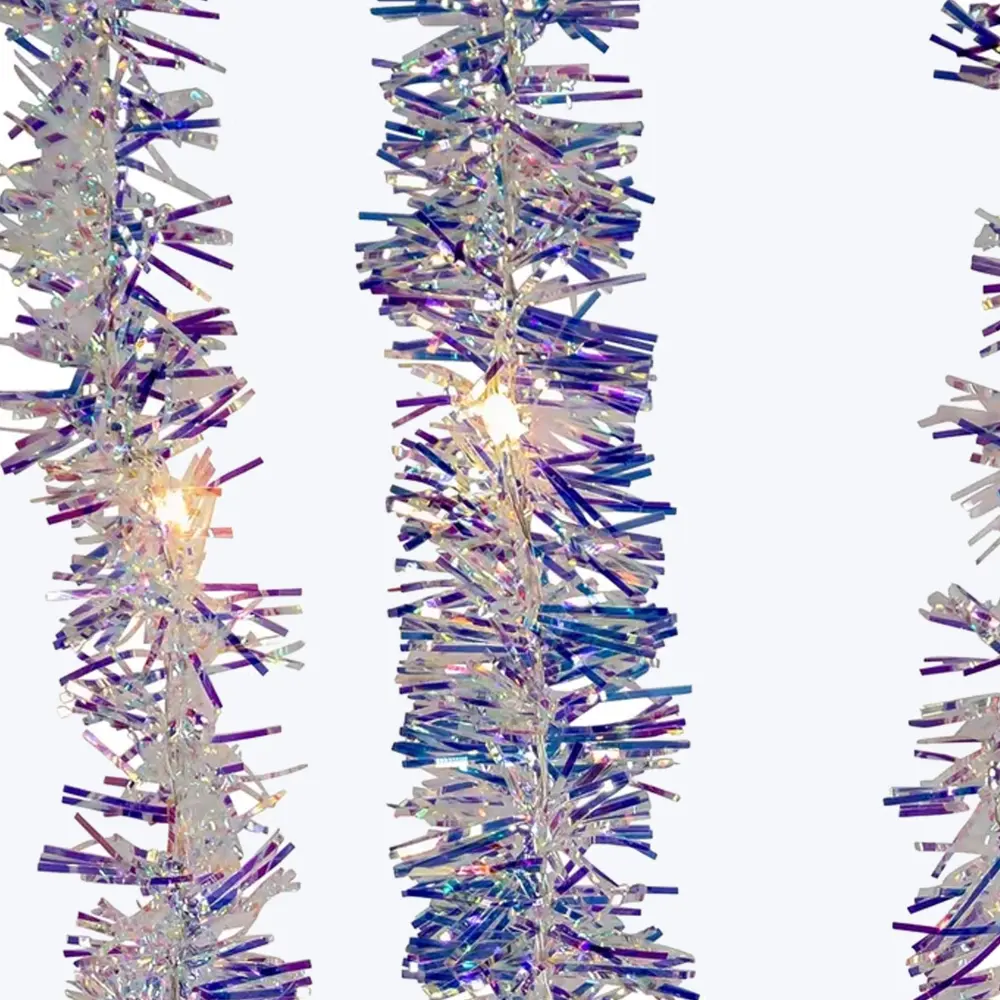 Add a nostalgic touch to your interiors with the 6.3′ Iridescent Tinsel Garland by abc home. Designed in iridescent sterling, this classic Christmas staple brings festive sparkle to any mantle or tree. Equipped with 20 warm white bulbs. Battery operated. Suitable for indoor use only.