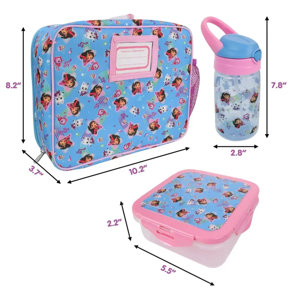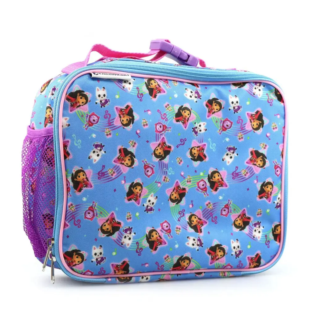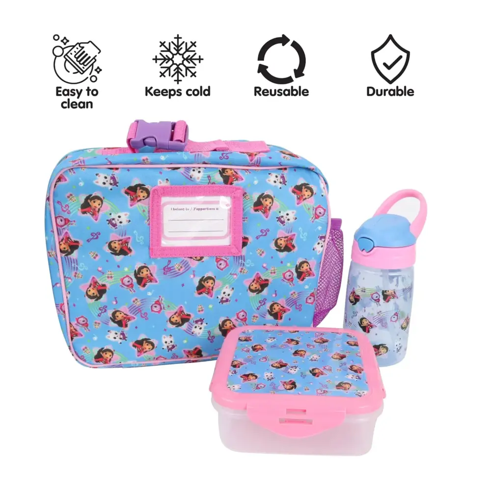 Insulated lunch bag with convenient sizable zipper closure. Top clip allows you to secure the lunch bag to your kids backpack. Side open-weave pocket holds a soft handle 430ml water bottle. Includes a printed sandwich container.