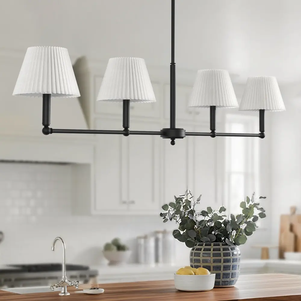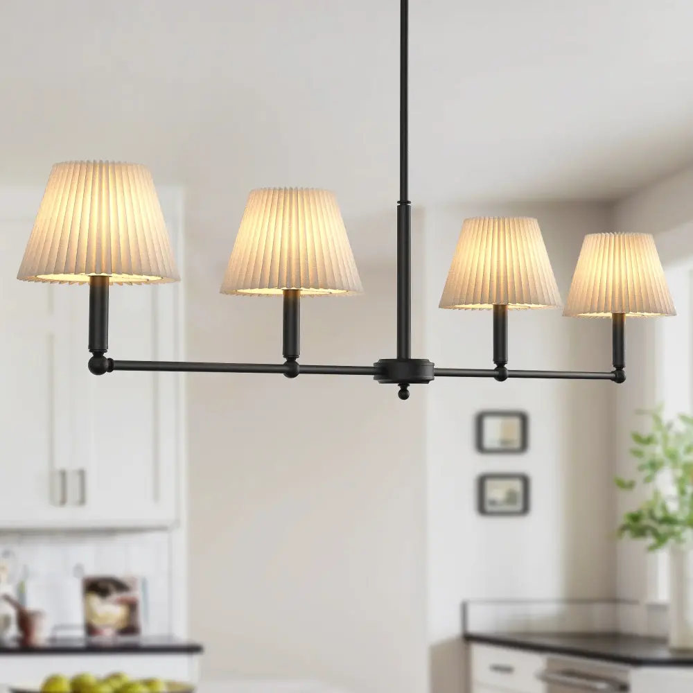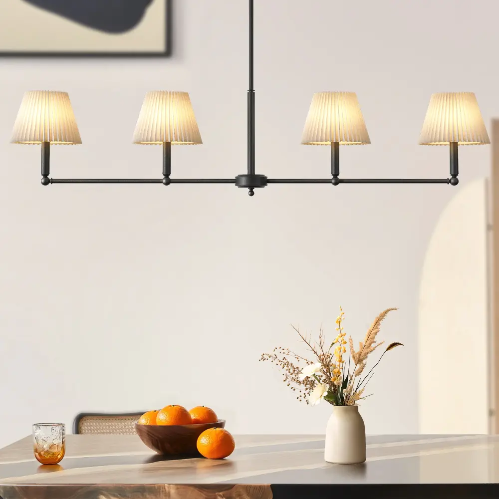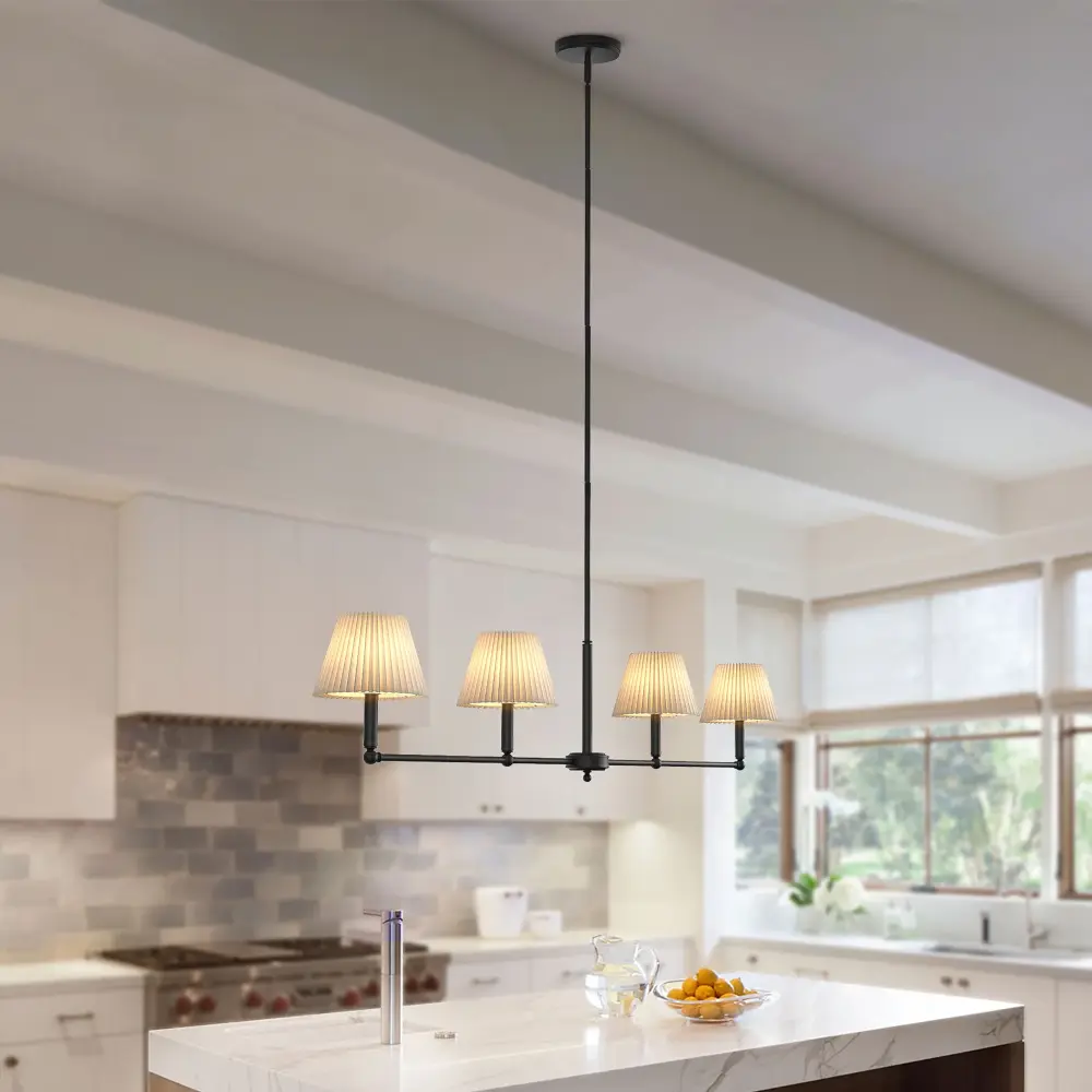Transform your dining space with this meticulously engineered 4-light pendant. Blending iconic mid-century modern aesthetics with cutting-edge functionality, its linear iron frame and handcrafted white flax shades deliver timeless elegance. The adjustable suspension system effortlessly adapts to vaulted ceilings.Perfect for casting a warm, layered glow over tables – where 1960s design meets contemporary innovation.