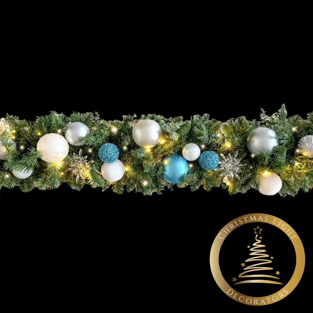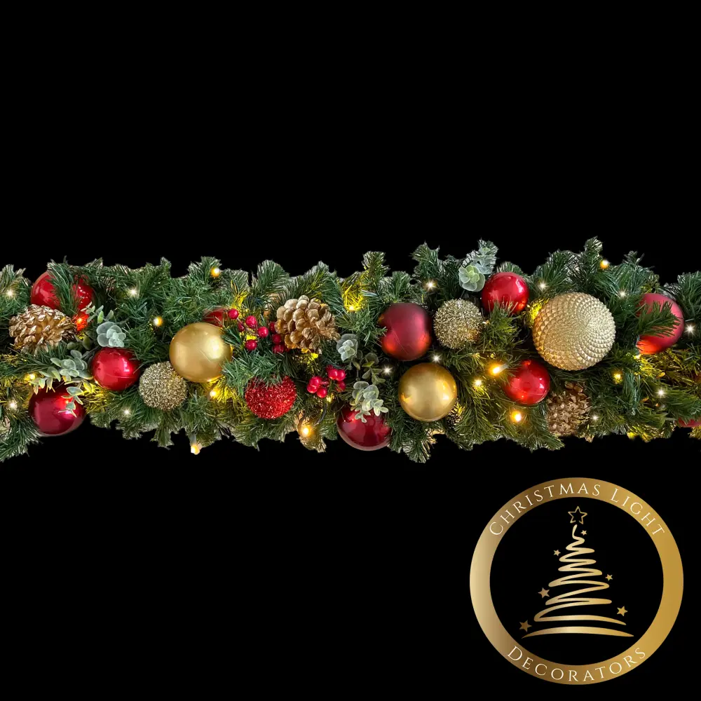 Stunning designer garland constructed by Christmas Light Decorators (CLD). The soft glow of warm white lights will add an old-fashioned flair to your Christmas!