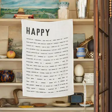 Our Happy towel lists commemorates a plethora of holidays, remembrances, and annual events, making it a supremely all-purpose gift. Inspired by traditional English tea towels — made from pure flax to avoid surface lint when drying delicate china and glassware — each towel is printed using silk screens and cut from running yardage that comes off the loom with selvage sides before we hem it by hand.