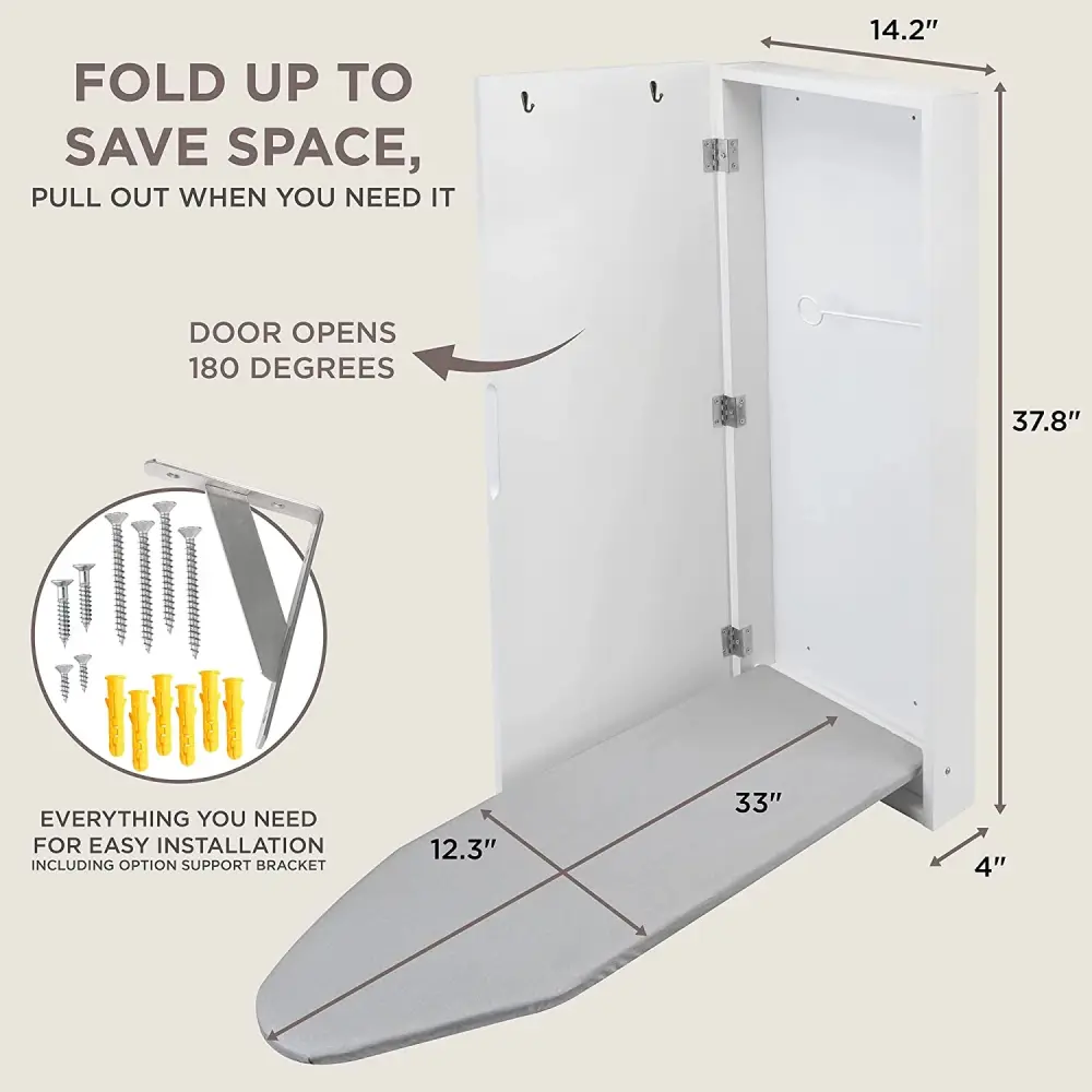 Ironing is now easier than ever with the Ivation Sleek Ironing Board Cabinet. Stop struggling with living room organization, purely open the cabinet door, unfold the wall ironing board, and steam away wrinkles from your clothing. When you’re done, just fold the foldable ironing board up, close the cabinet, and move on with your day. The high-quality materials and build quality make this sleeve ironing board wall mount a sturdy addition to your home. This cabinet Iron Board is as tough as it is stylish. The superior materials and excellent build quality make this wall mount ironing board a sturdy addition to your home. Cleaning is easy with the removable hanging ironing board cover.