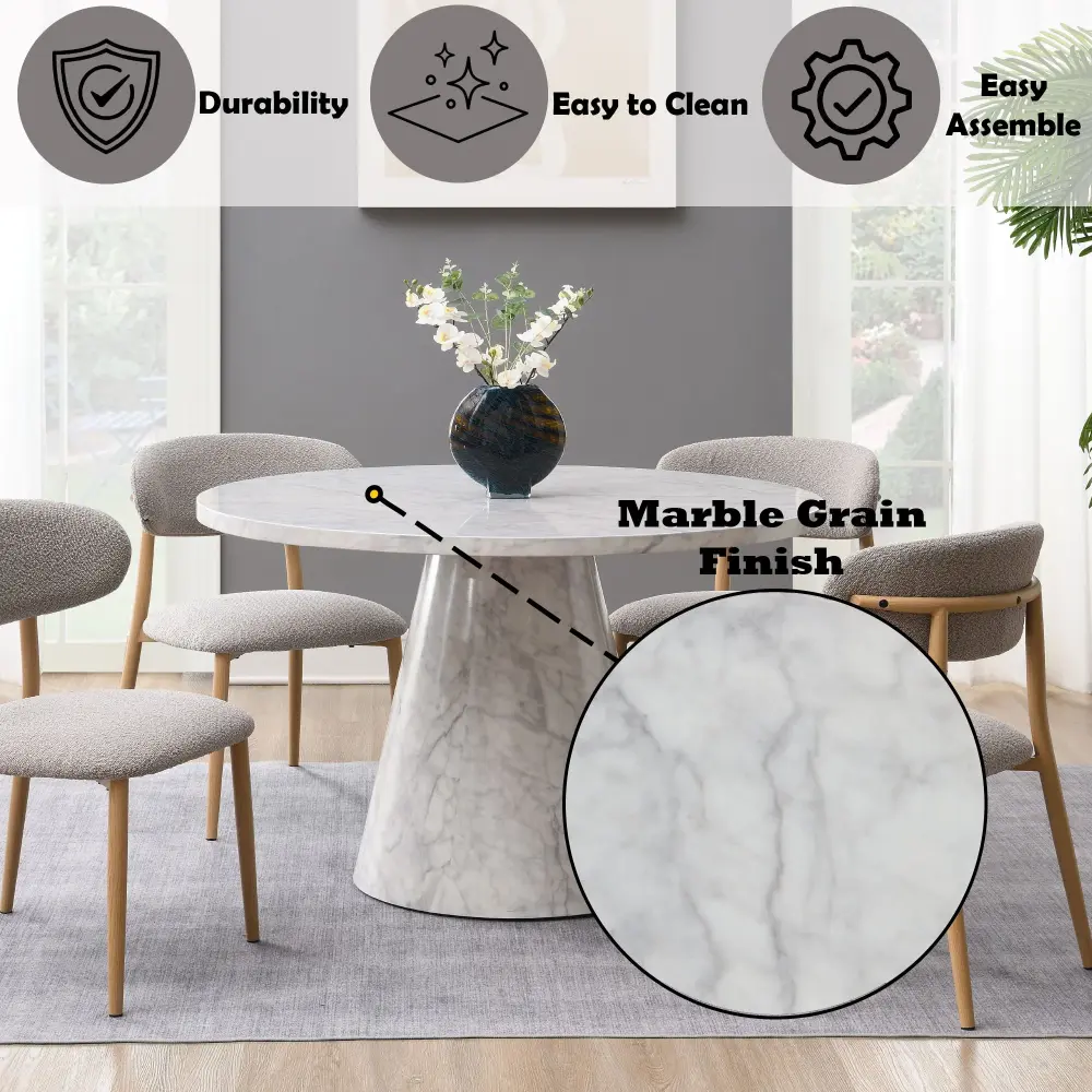 - Elegant Design: This dining table has a stylish engineered stone finish with a round, fixed timber tabletop, enhanced by a marble grain finish that adds a touch of elegance to any dining space.