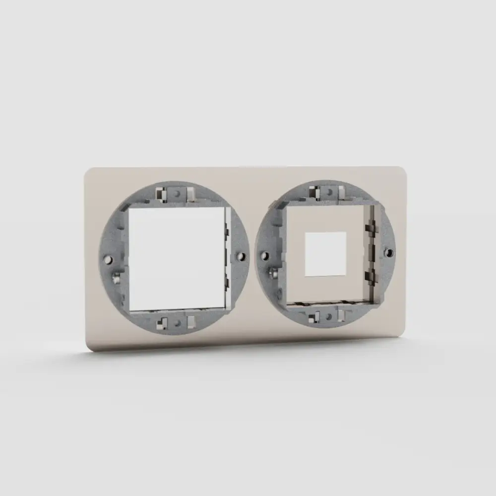 This Kew double 1x keystone and 1x 45mm module plate in polished nickel performs with any one of our 20mm keystone modules and any one of our polished nickel rocker switches or our 45mm socket modules.