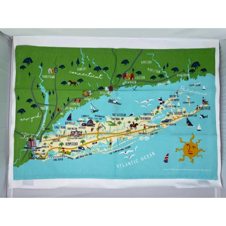 Whimsical depiction of Long Island on a 18″ x 28″ cotton Tea Towel.