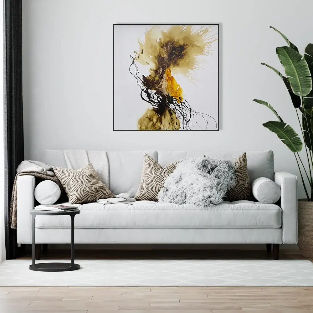 Oil paint on utility fabric, hand painted in limited series by artists, complete with a black wooden frame.