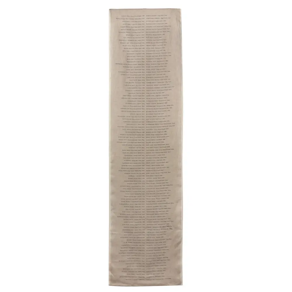 The North American Oysters runner has selvedge left and right edges and top and bottom rolled hem, and has been given a soft wash for a airy and easy hand. We challenge you to find a more comprehensive list of North American oysters than this index of these tasty little mollusks. (If you do, please tell us!)