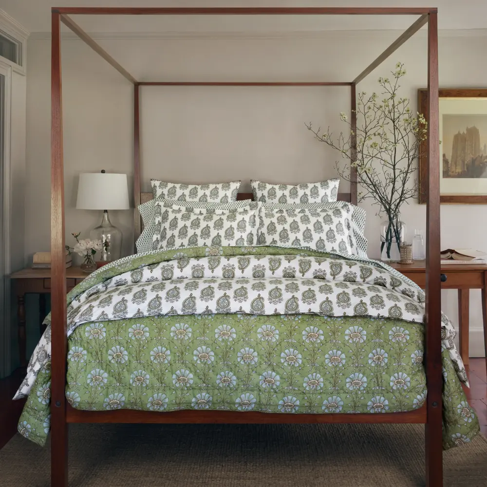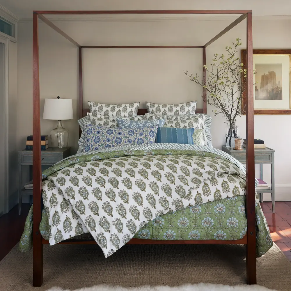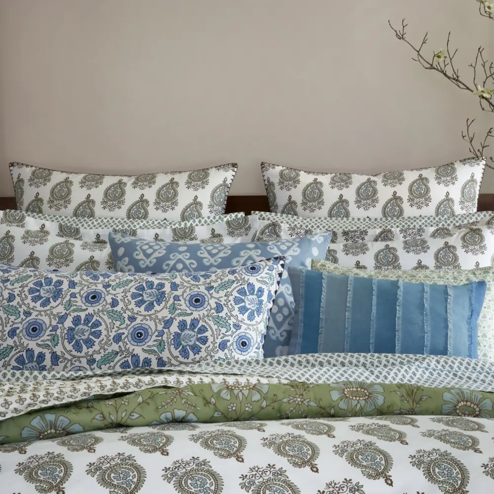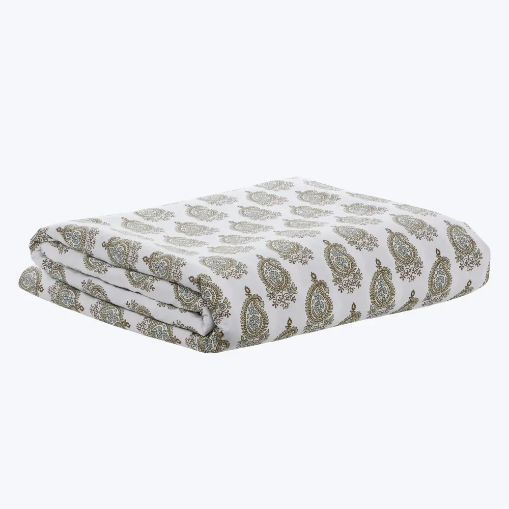 Crafted from green long staple cotton percale, this duvet showcases a delightful motif of dainty half paisley drops, lending a fresh and playful touch. It boasts exceptional softness and smoothness for a luxurious sleeping experience. 200 Thread Count.